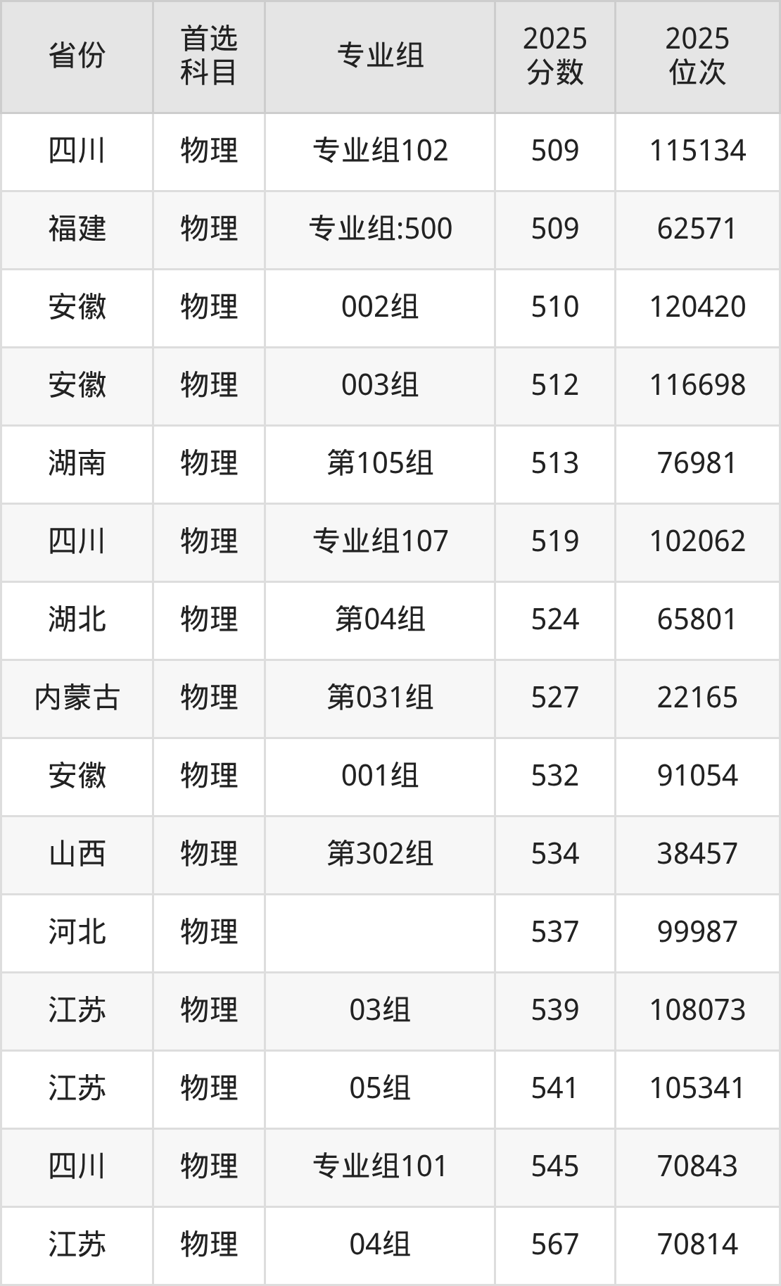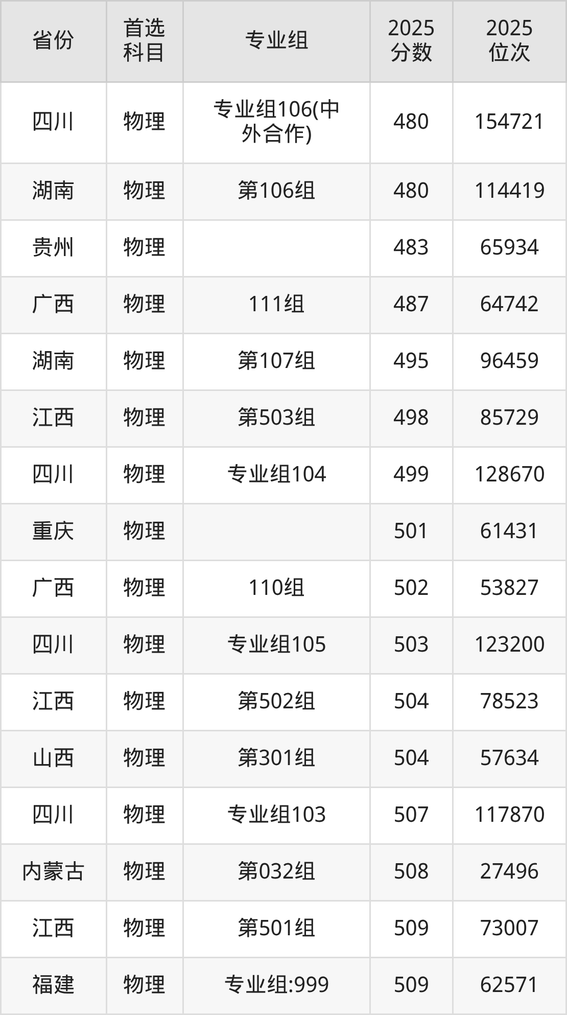 物理类:专业组101545分、70843名,专业组102509分、115134名,专业组103507分、117870名,专业组104499分、128670名,专业组105503分、123200名,专业组106(中外合作)480分、154721名,专业组107519分、102062名;