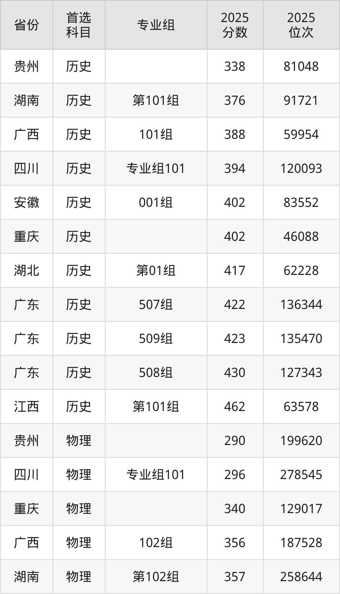 历史类最低分对应地区为贵州,录取位次为81048,超专科线158分;最高分对应地区为江西(第101组),录取位次为63578,超专科线172分。