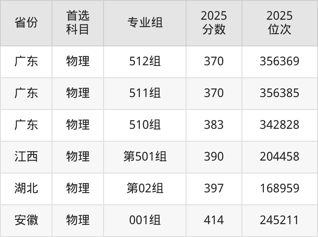 物理类最低分对应地区为贵州,录取位次为199620;最高分对应地区为安徽(001组),录取位次为245211,超专科线214分。