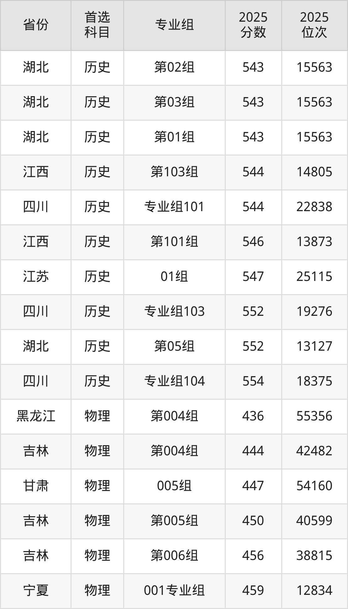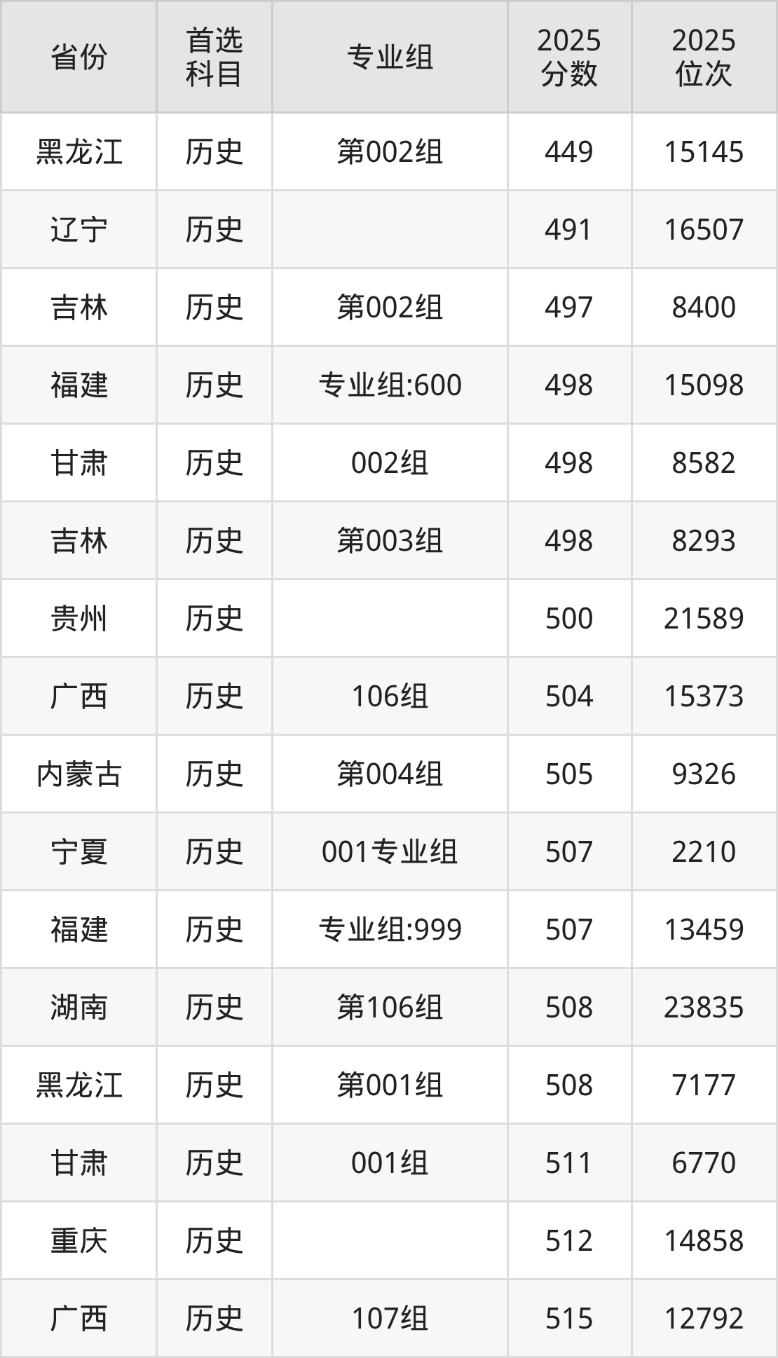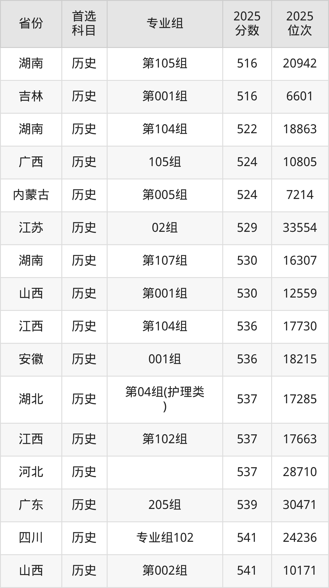 历史类:专业组101544分、22838名,专业组102541分、24236名,专业组103552分、19276名,专业组104554分、18375名;