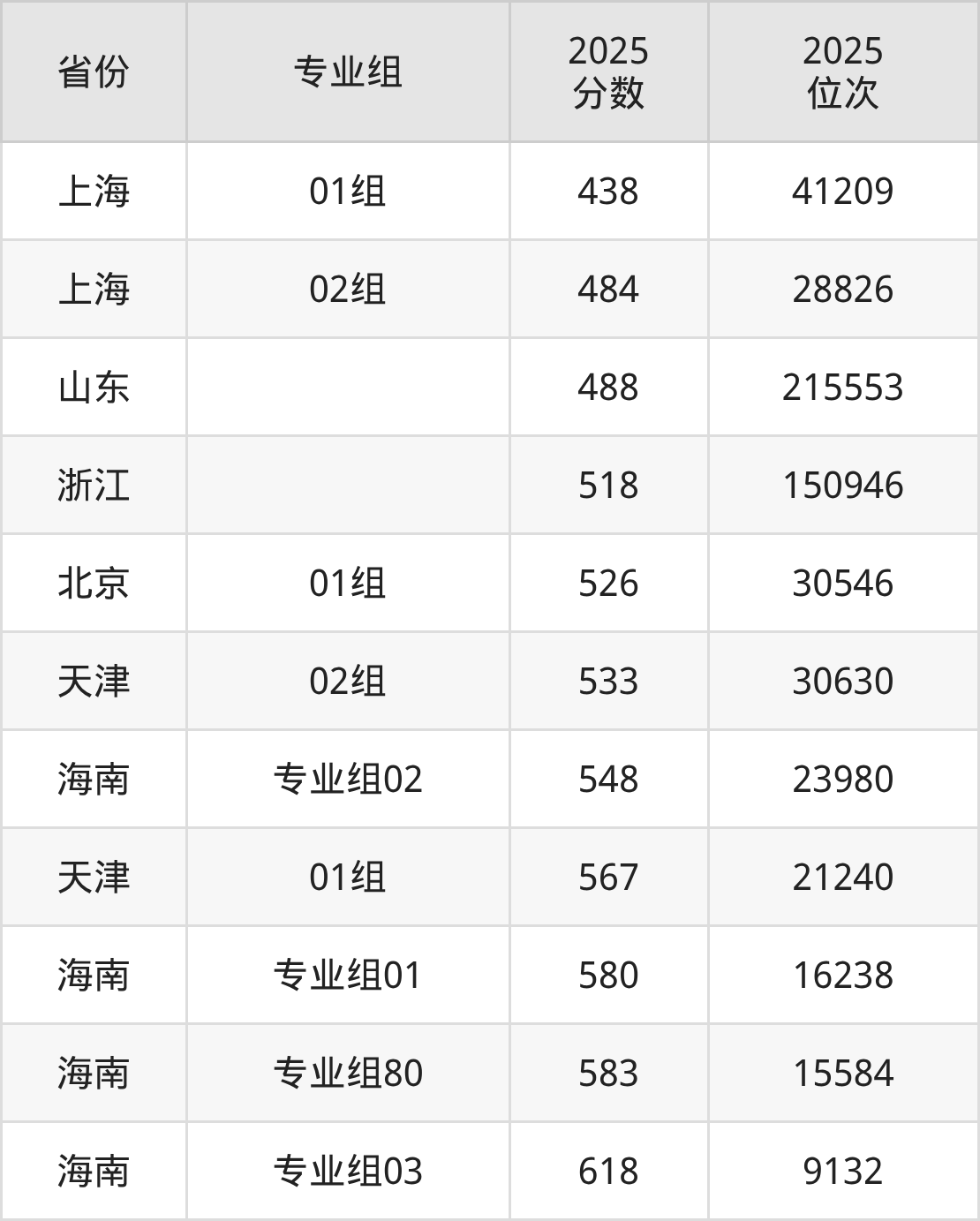 最低分对应地区为上海(01组),录取位次为41209,超本科线36分;最高分对应地区为海南(专业组03),录取位次为9132,超本科线138分。