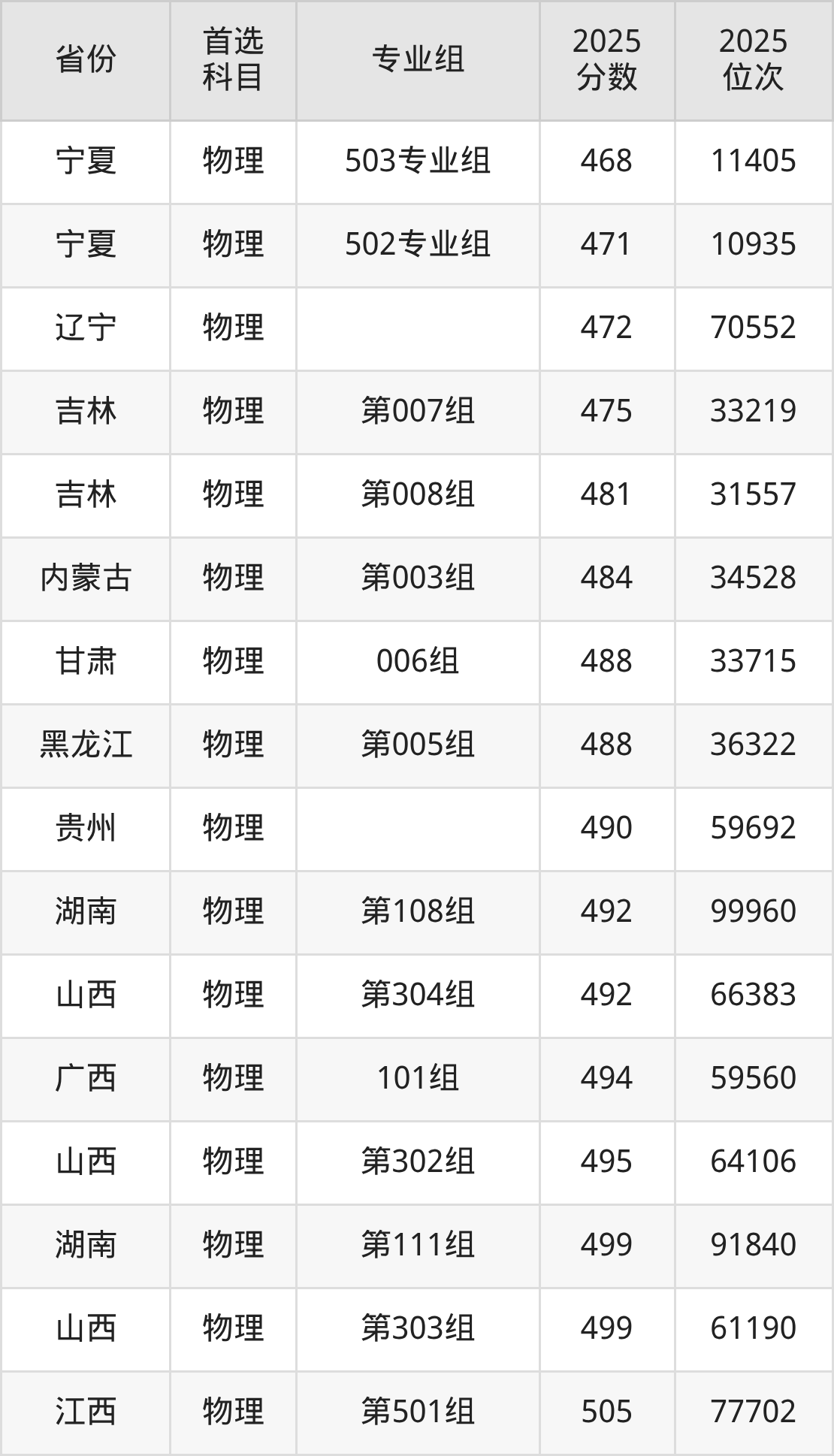 物理类最低分对应地区为黑龙江(第004组),录取位次为55356,超本科线76分;最高分对应地区为江苏(06组),录取位次为77093,超本科线99分。