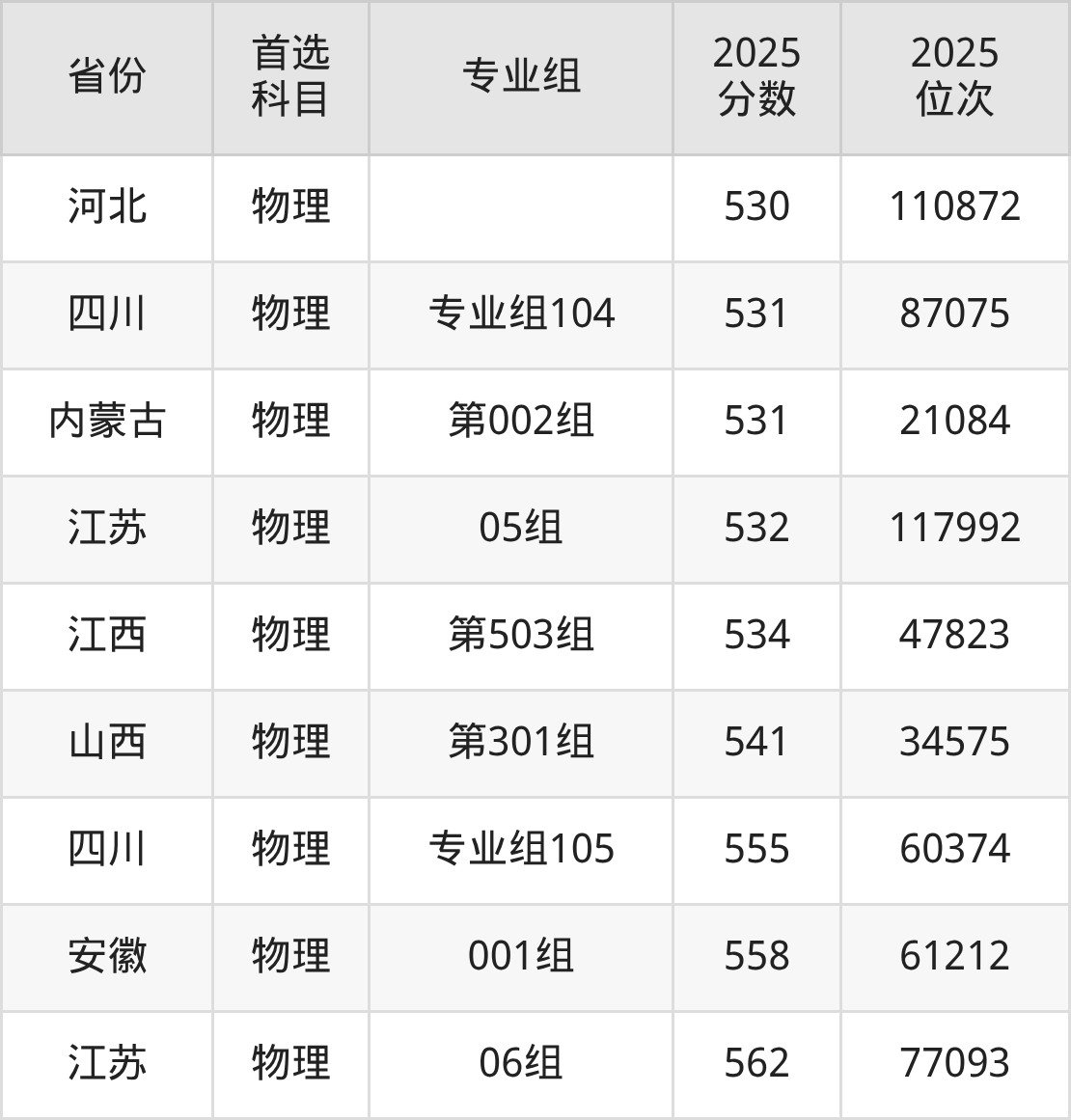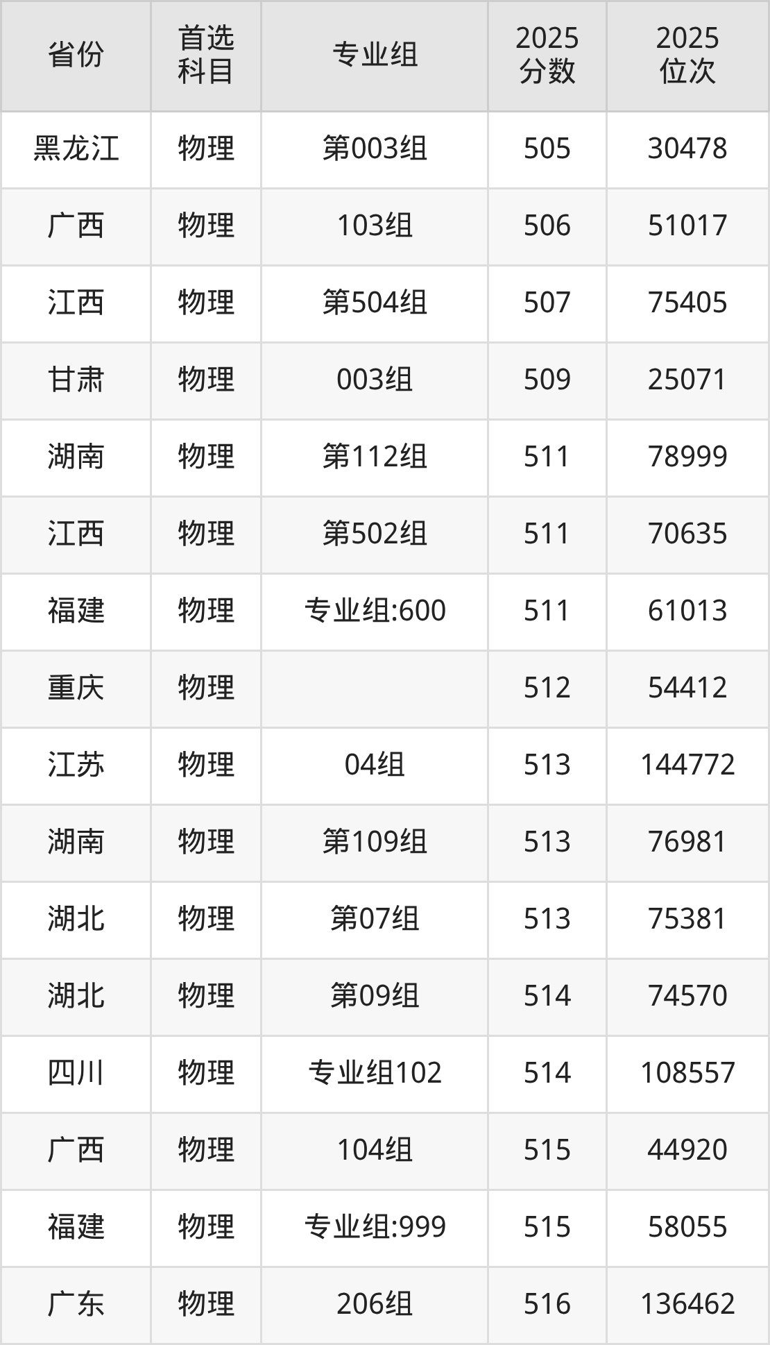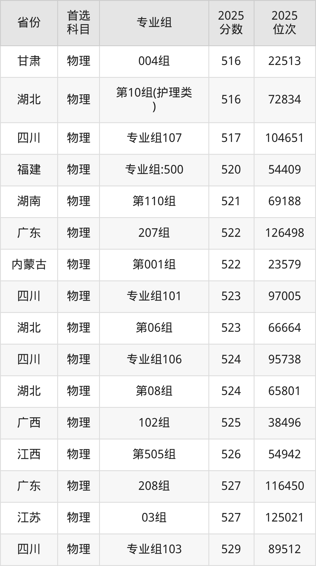物理类:专业组101523分、97005名,专业组102514分、108557名,专业组103529分、89512名,专业组104531分、87075名,专业组105555分、60374名,专业组106524分、95738名,专业组107517分、104651名;