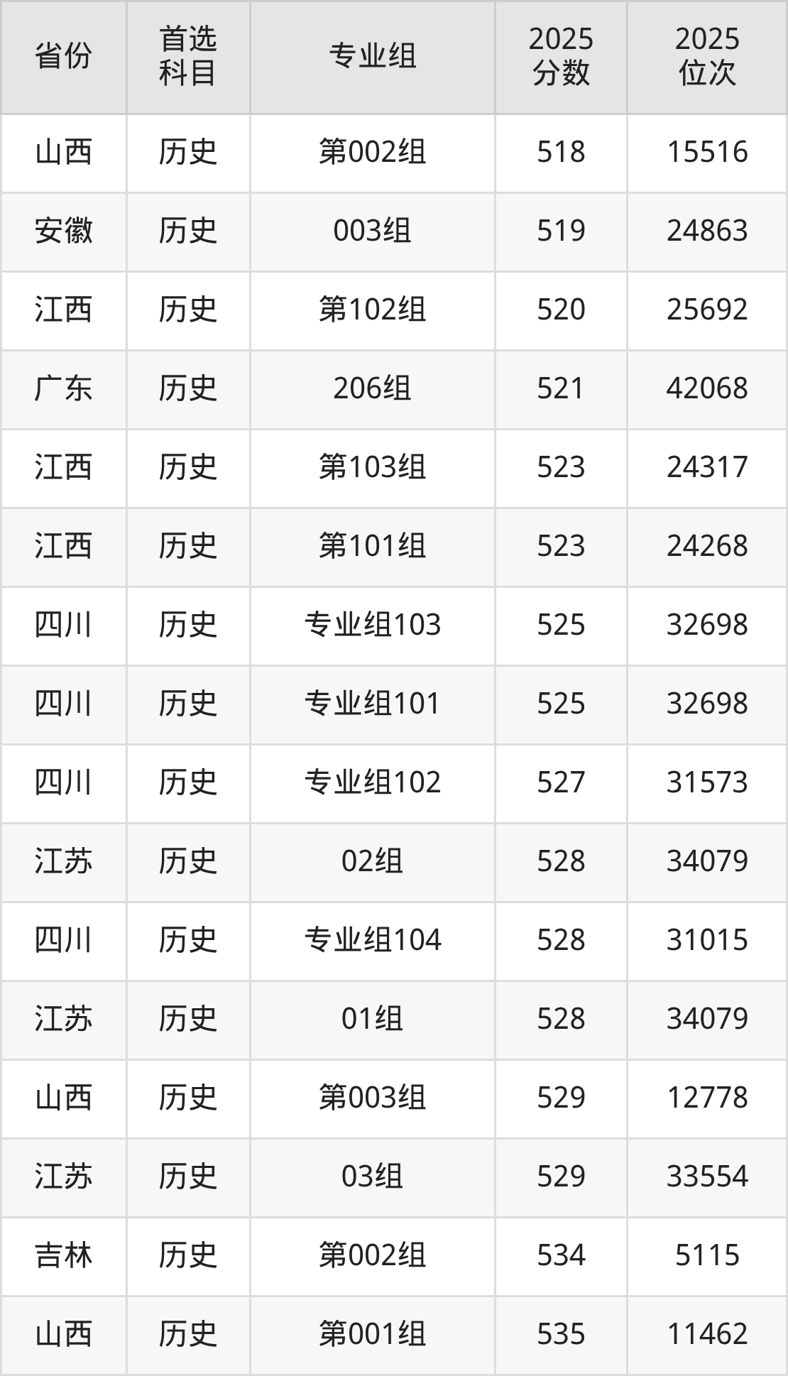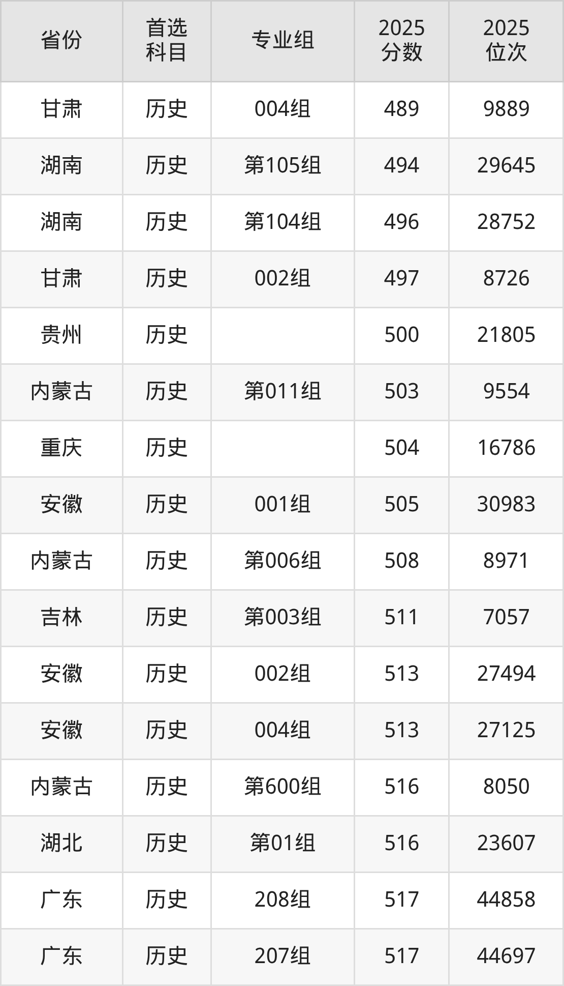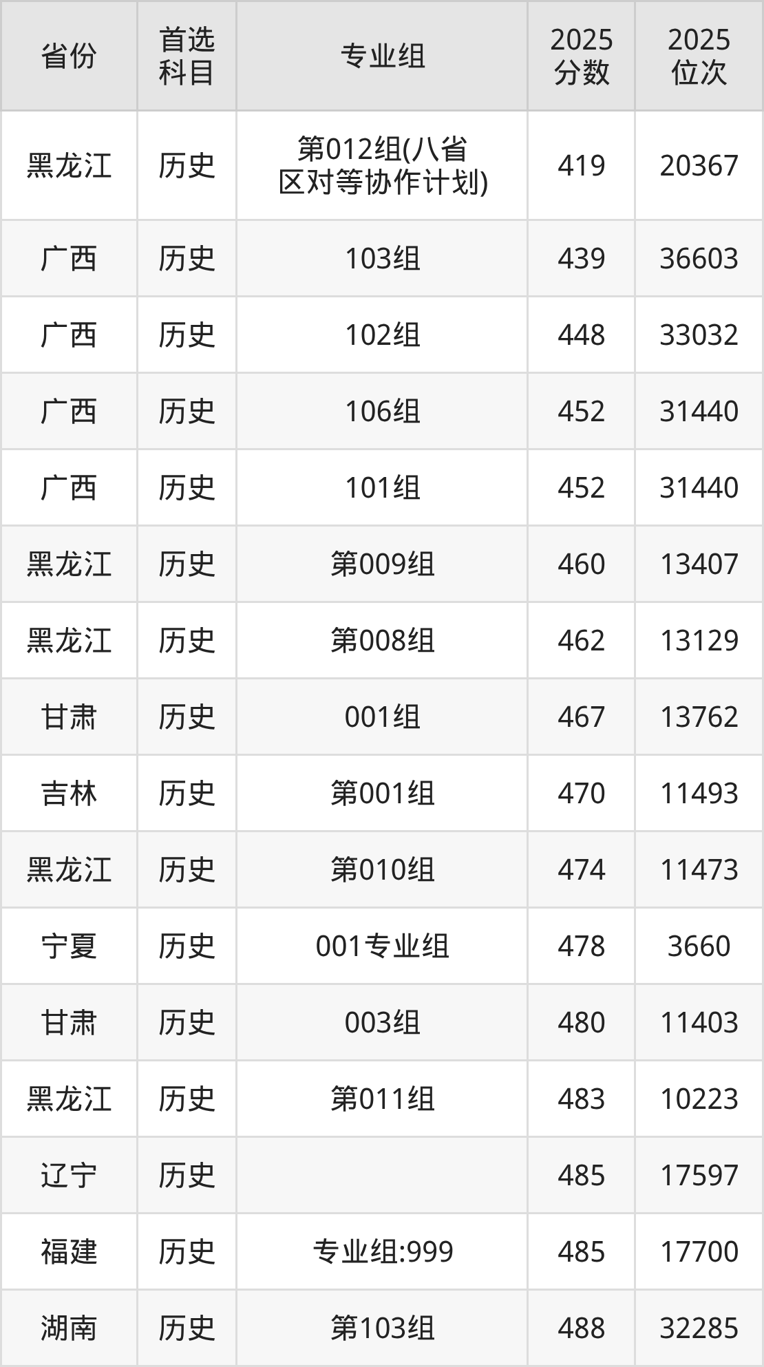 历史类最低分对应地区为黑龙江(第012组(八省区对等协作计划)),录取位次为20367,超本科线14分;最高分对应地区为四川(专业组105),录取位次为23750,超本科B75分。
