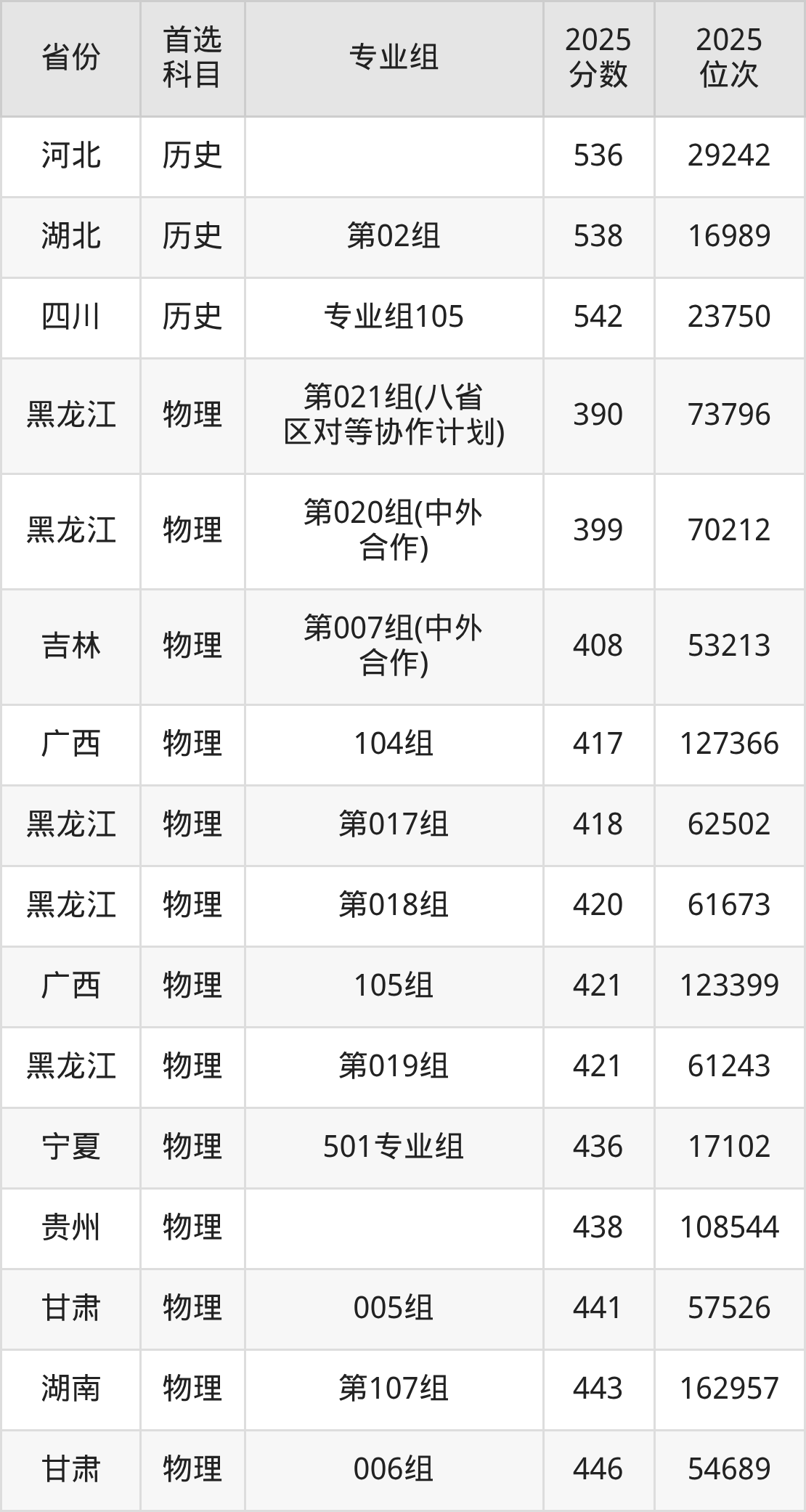 2025年哈尔滨学院在新高考3+1+2地区的录取分数线为:历史类419分-542分、物理类390分-524分。