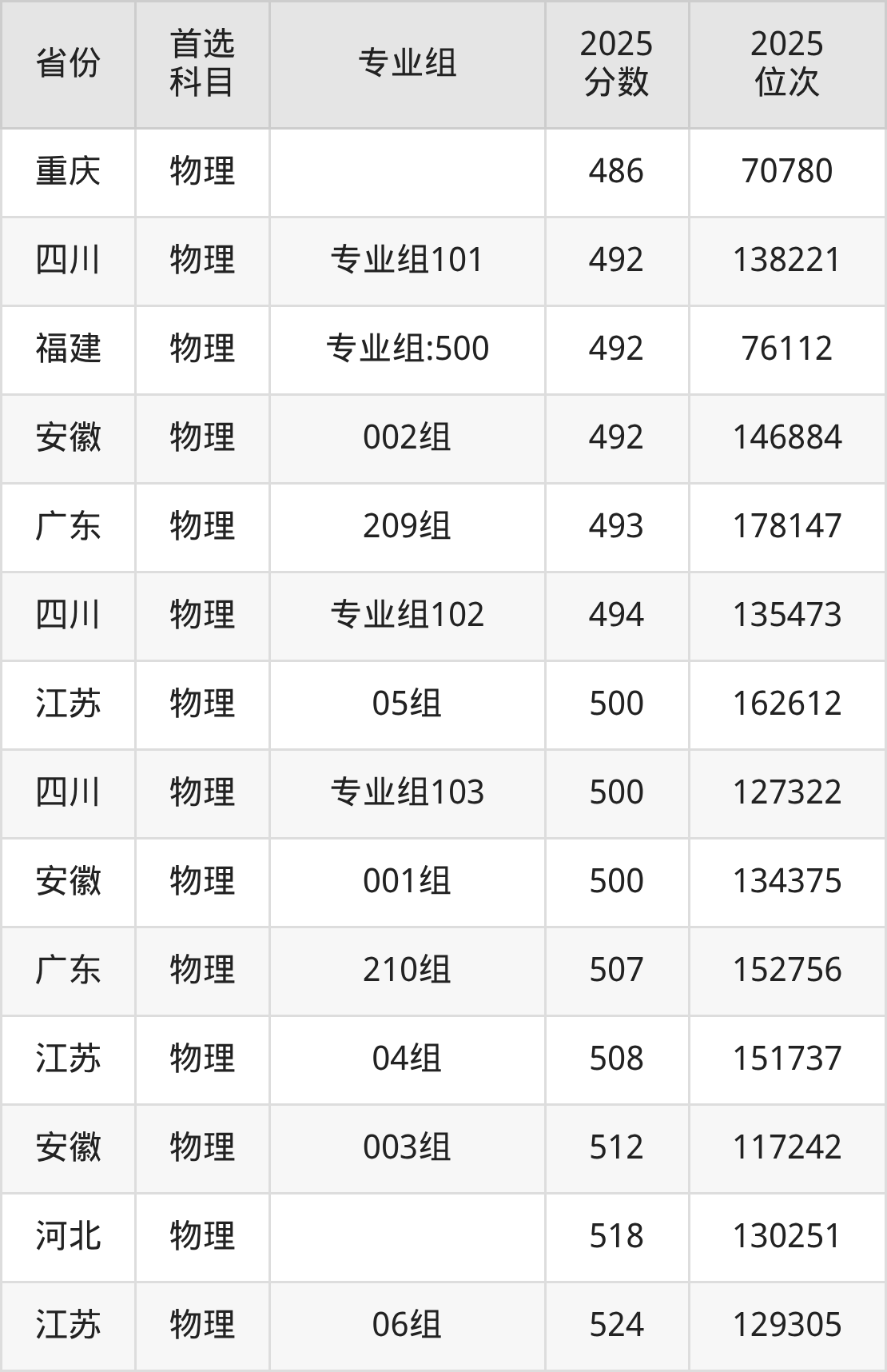 物理类最低分对应地区为黑龙江(第021组(八省区对等协作计划)),录取位次为73796;最高分对应地区为江苏(06组),录取位次为129305,超本科线61分。