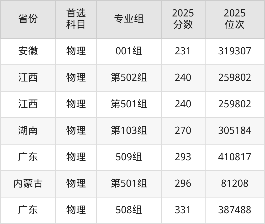 物理类最低分对应地区为四川(专业组101),录取位次为284789;最高分对应地区为广东(508组),录取位次为387488,超专科线131分。
