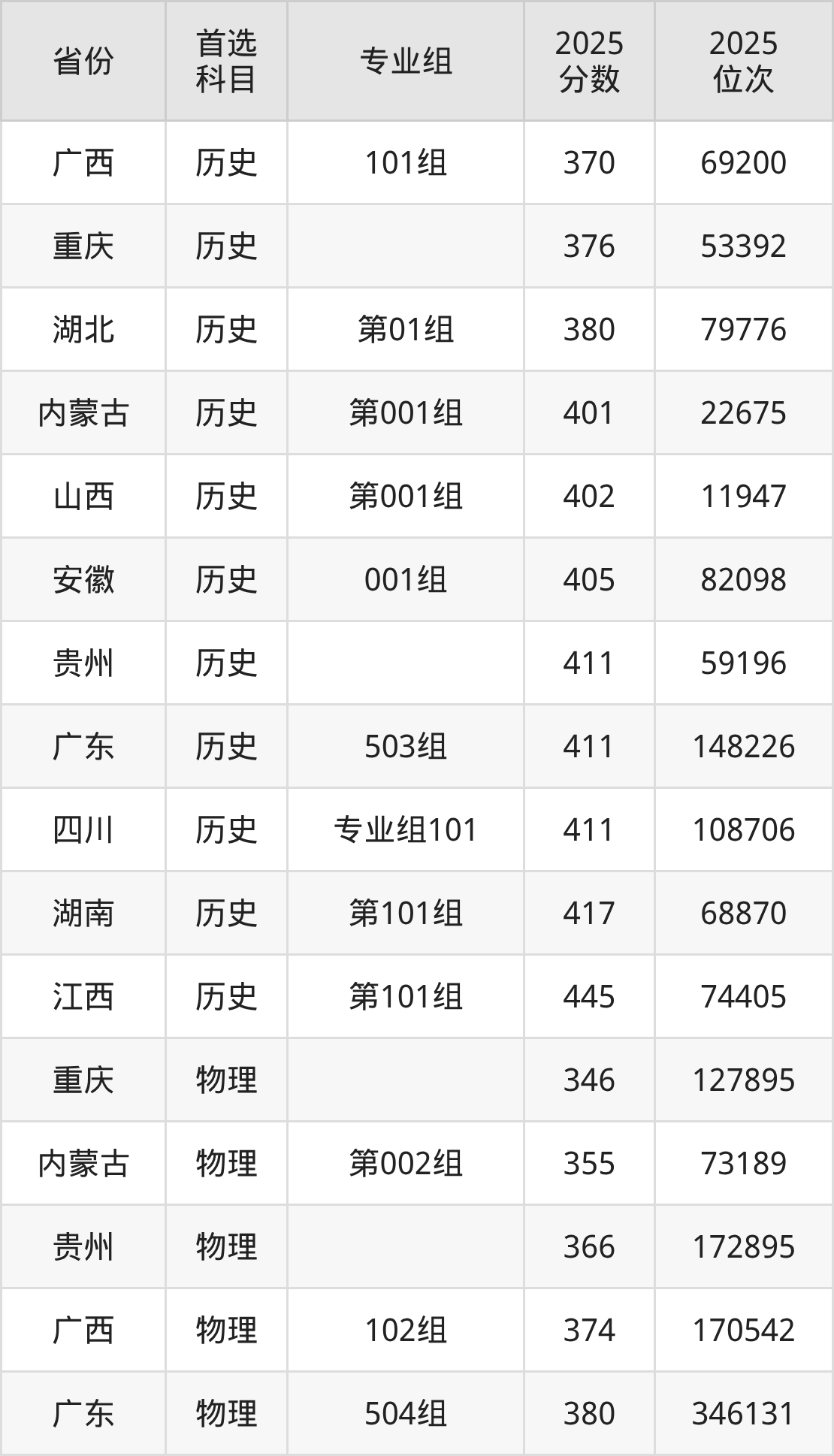 历史类最低分对应地区为广西(101组),录取位次为69200;最高分对应地区为江西(第101组),录取位次为74405,超专科线155分。