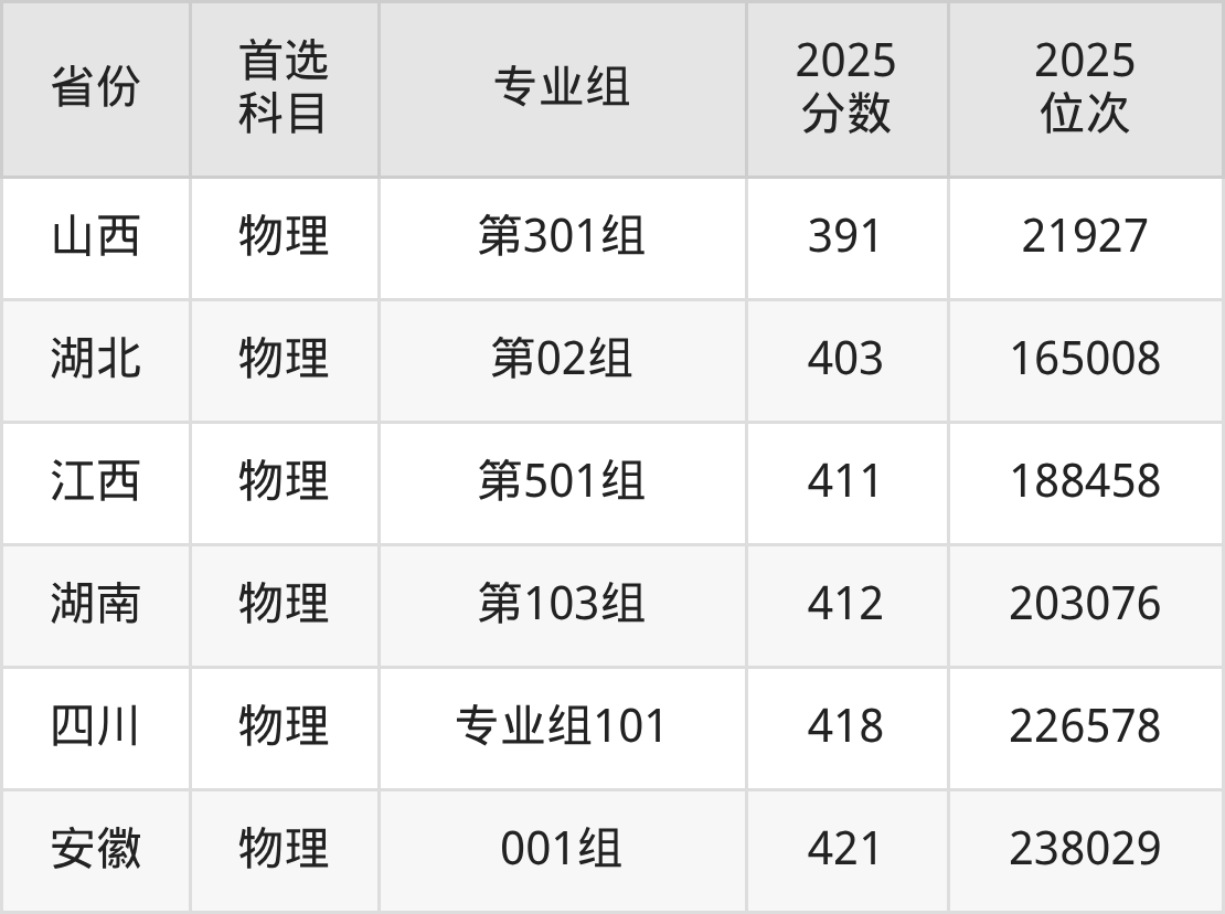 物理类最低分对应地区为重庆,录取位次为127895,超专科线166分;最高分对应地区为安徽(001组),录取位次为238029,超专科线221分。