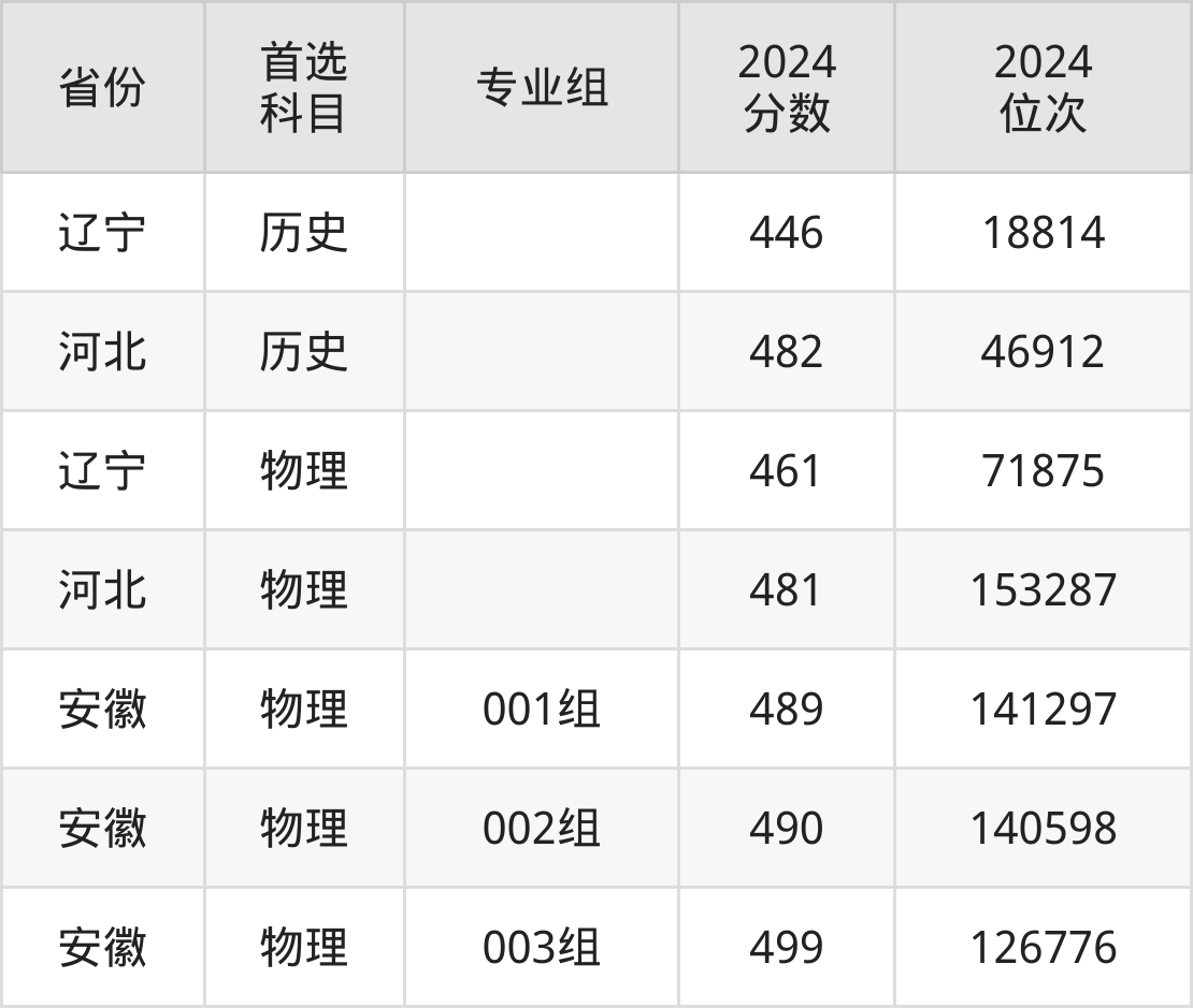 物理类最低分对应地区为辽宁,录取位次为71875,超本科线93分;最高分对应地区为安徽(003组),录取位次为126776,超本科线34分。
