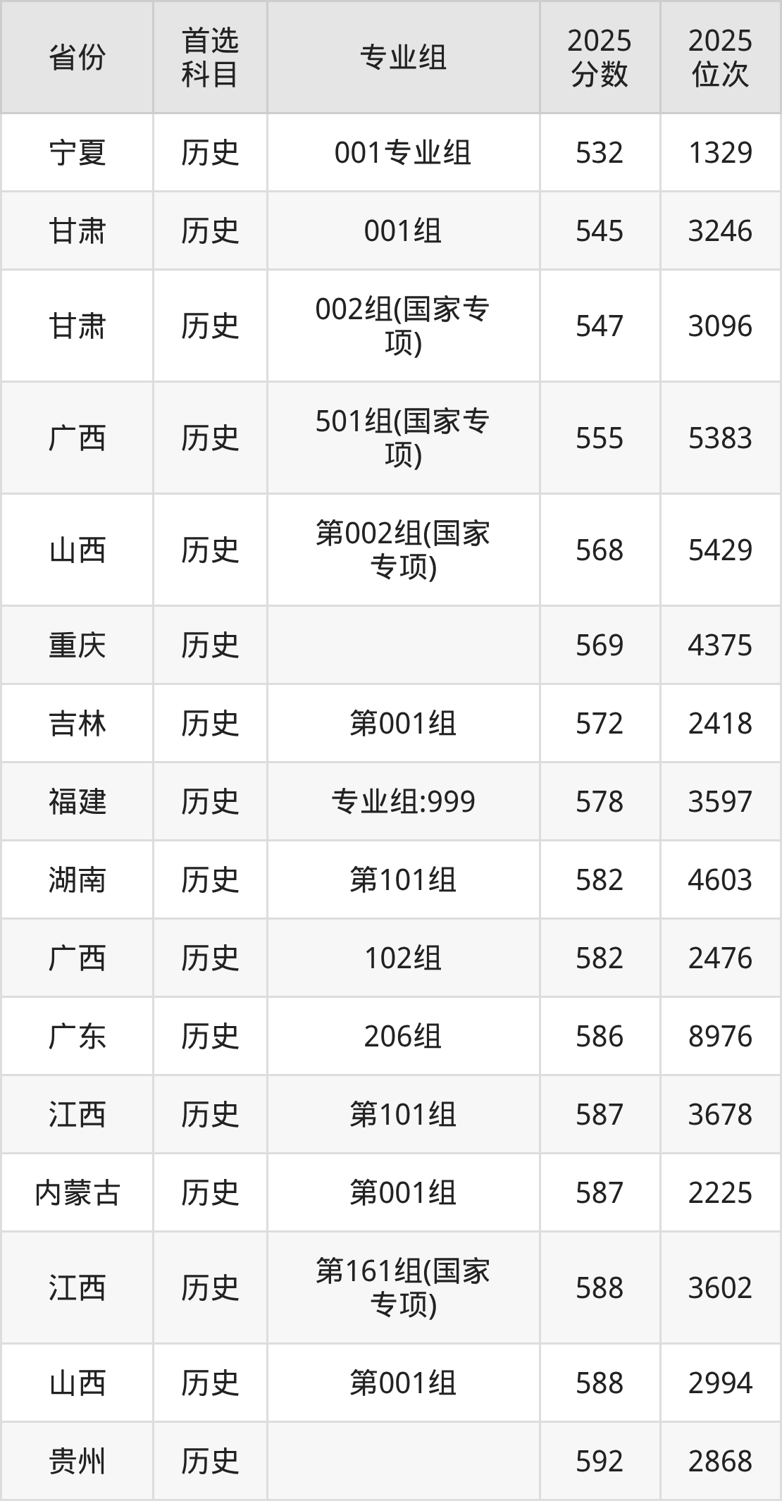 历史类最低分对应地区为宁夏(001专业组),录取位次为1329,超本科B128分;最高分对应地区为河北,录取位次为4558。