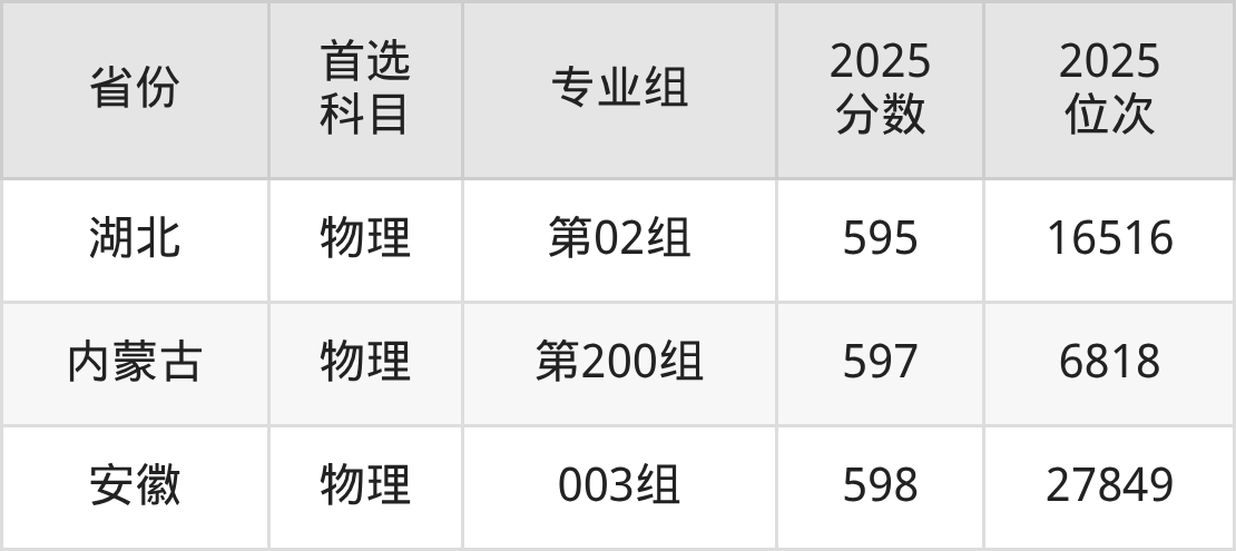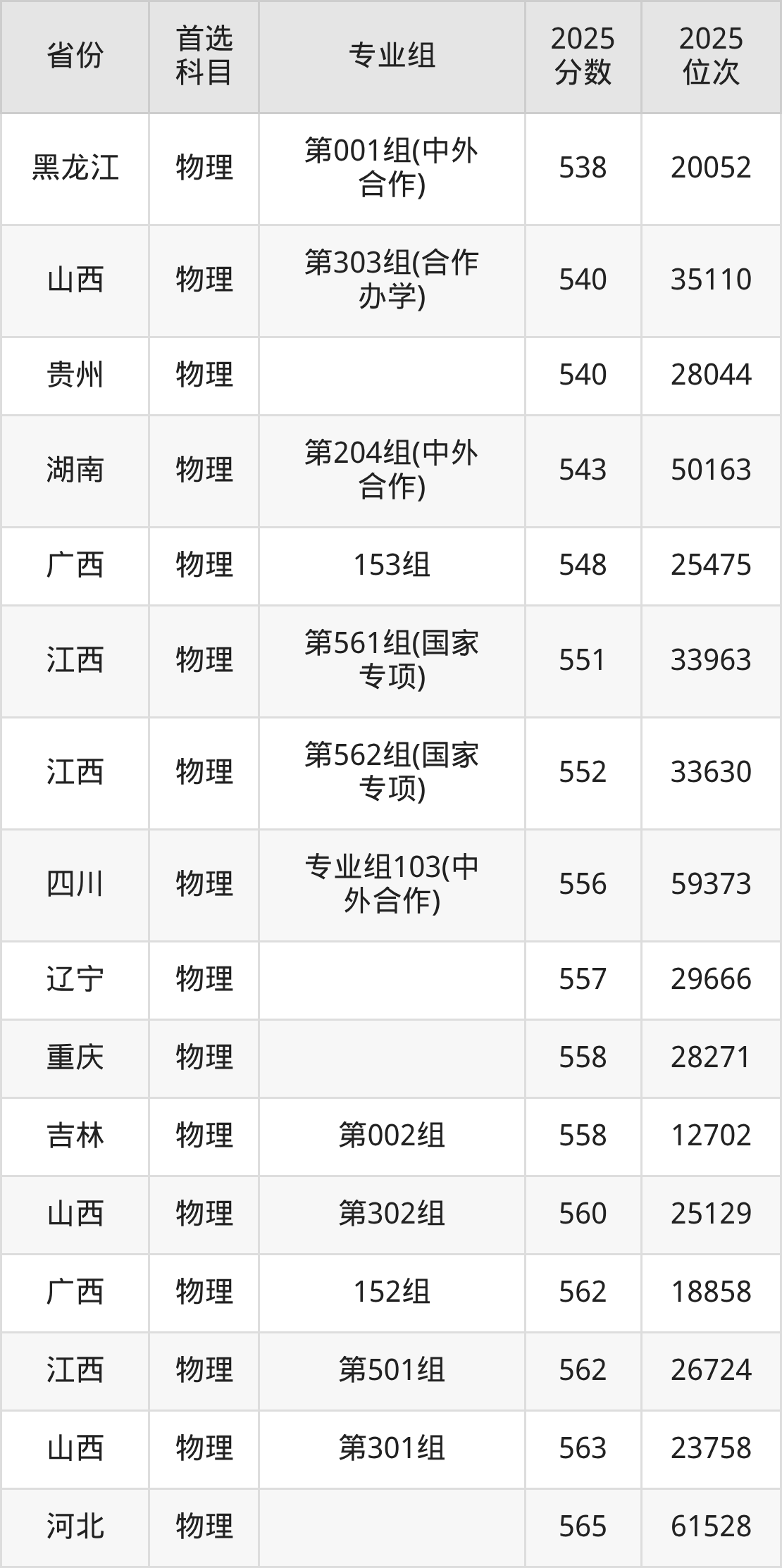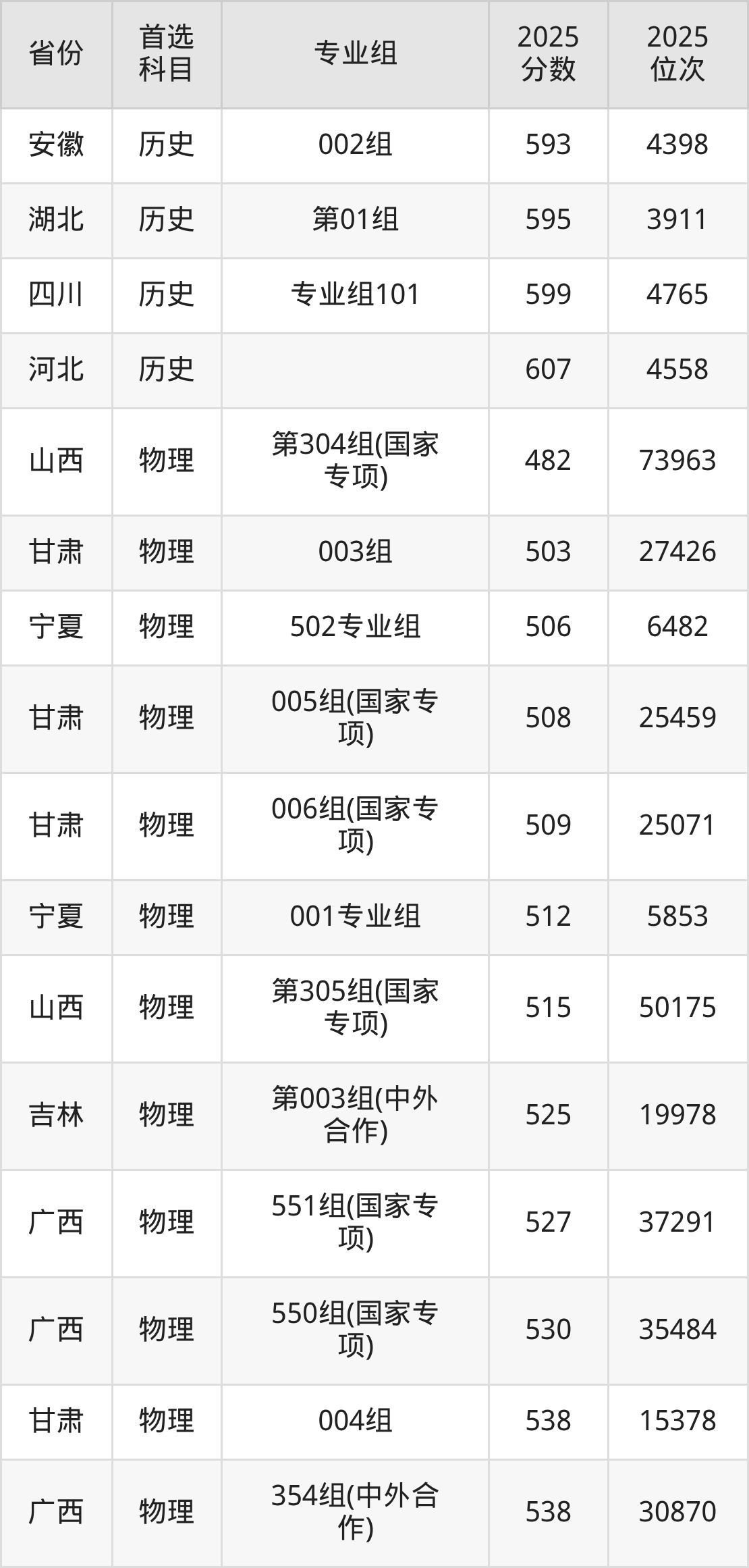 物理类最低分对应地区为山西(第304组(国家专项)),录取位次为73963,超本科线63分;最高分对应地区为安徽(003组),录取位次为27849,超本科线137分。