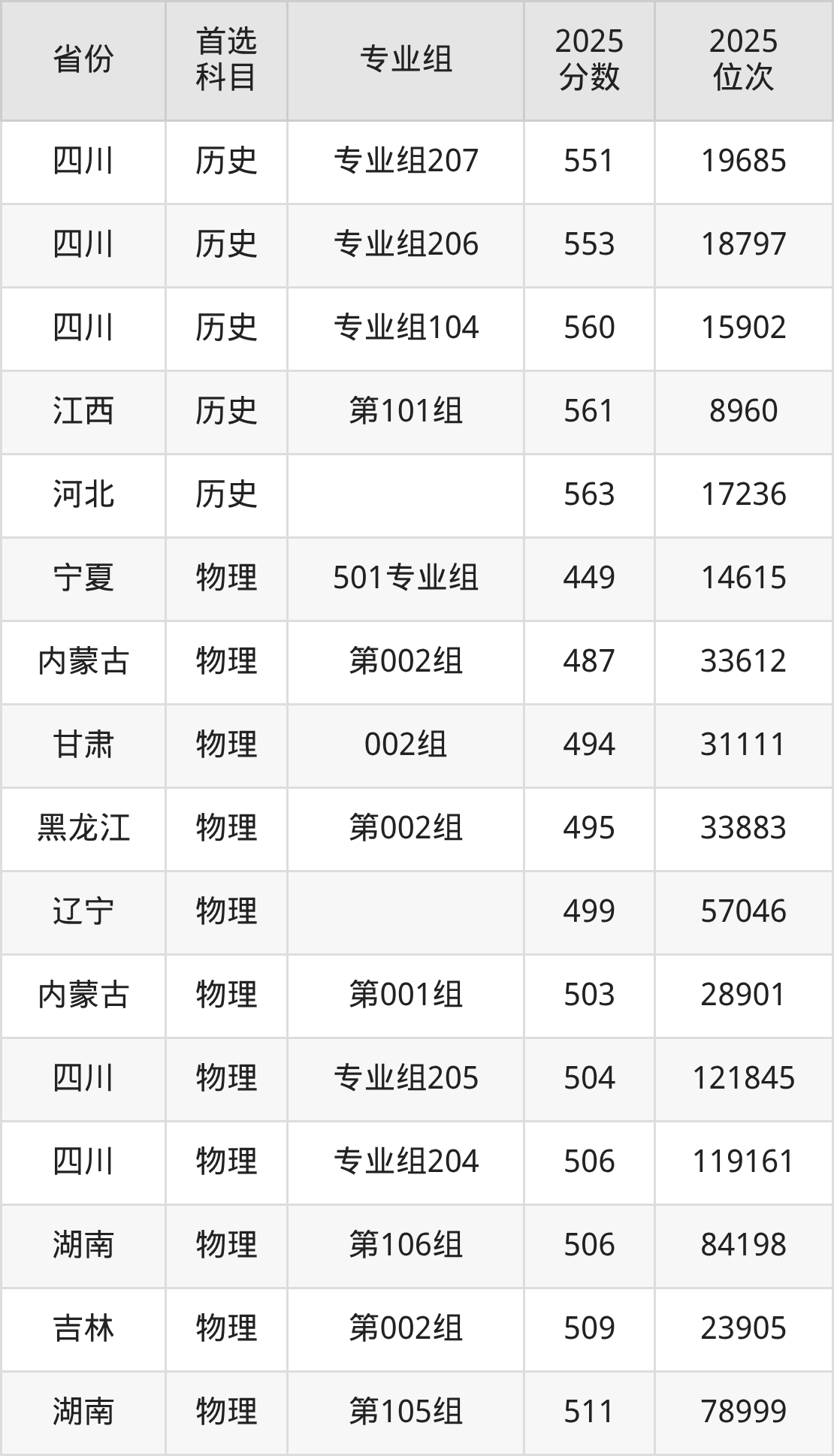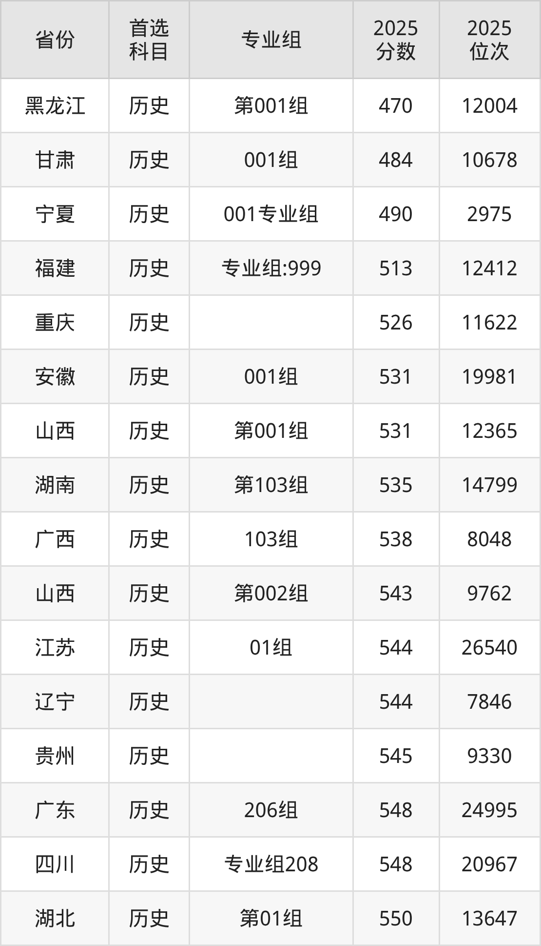 历史类:专业组104560分、15902名,专业组206553分、18797名,专业组207551分、19685名,专业组208548分、20967名;