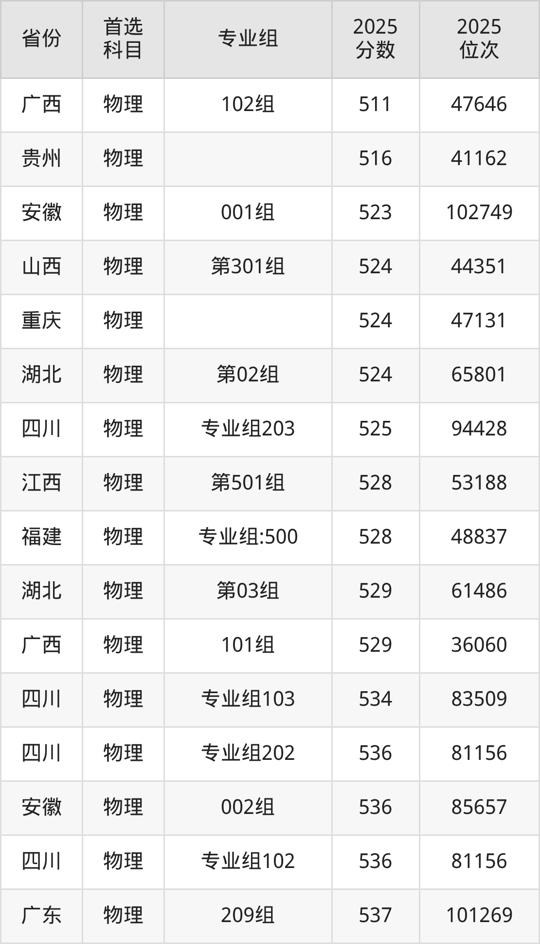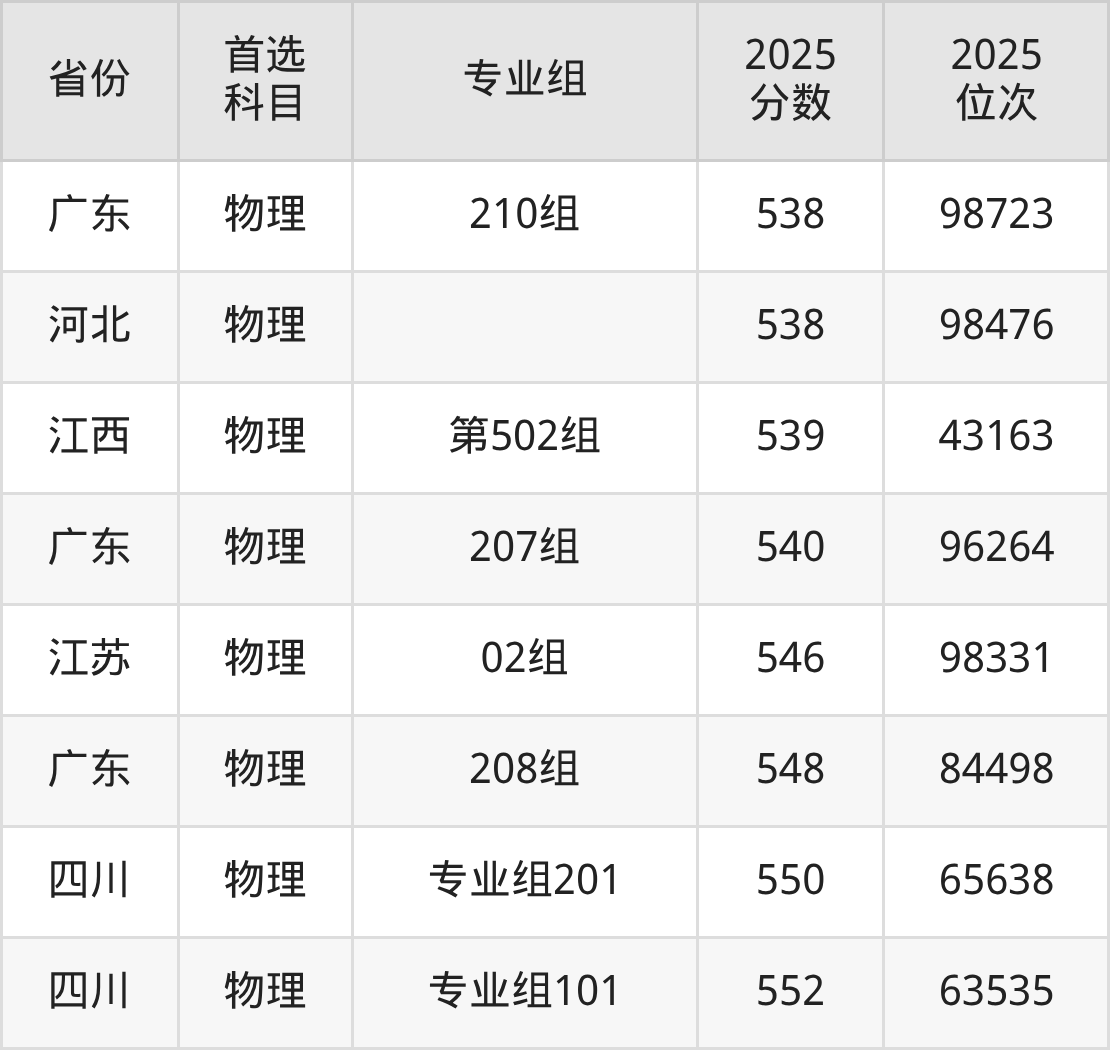 物理类:专业组101552分、63535名,专业组102536分、81156名,专业组103534分、83509名,专业组201550分、65638名,专业组202536分、81156名,专业组203525分、94428名,专业组204506分、119161名,专业组205504分、121845名;