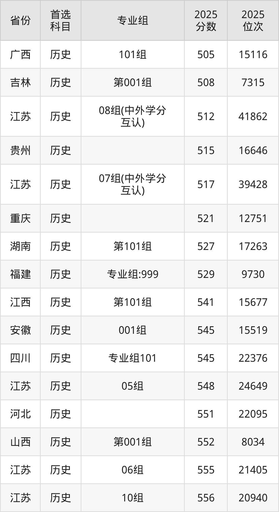 历史类:04组554分、16408名,05组540分、22032名,06组534分、24576名,07组540分、22032名,08组(高校中外联合培养)508分、36594名,09组(高校中外联合培养)480分、49649名,10组553分、16795名,11组541分、21616名;