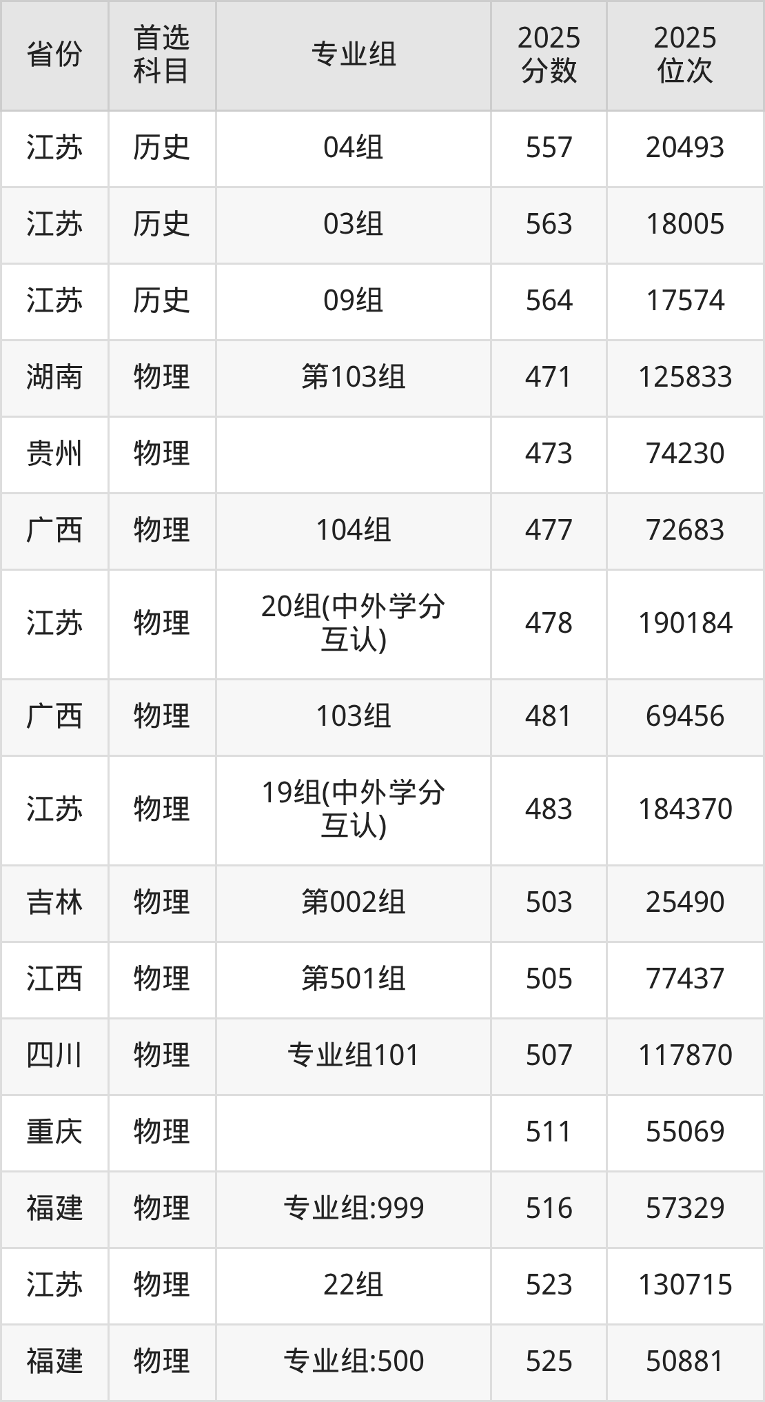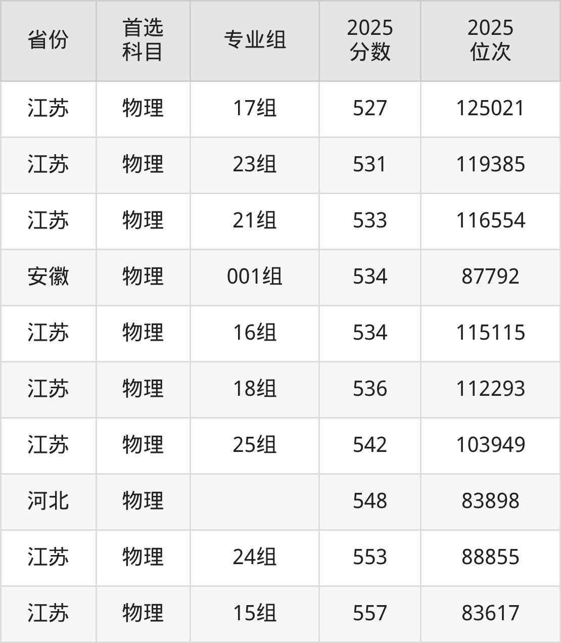 物理类:16组560分、68149名,17组535分、98547名,18组530分、104893名,19组533分、101148名,20组(高校中外联合培养)504分、138642名,21组(高校中外联合培养)463分、186047名,22组538分、94705名,23组516分、122991名,24组554分、75080名,25组540分、92181名;
