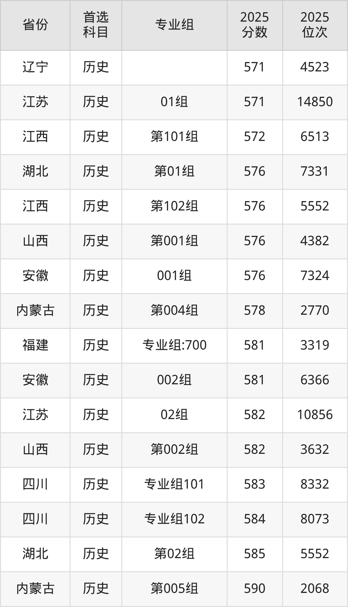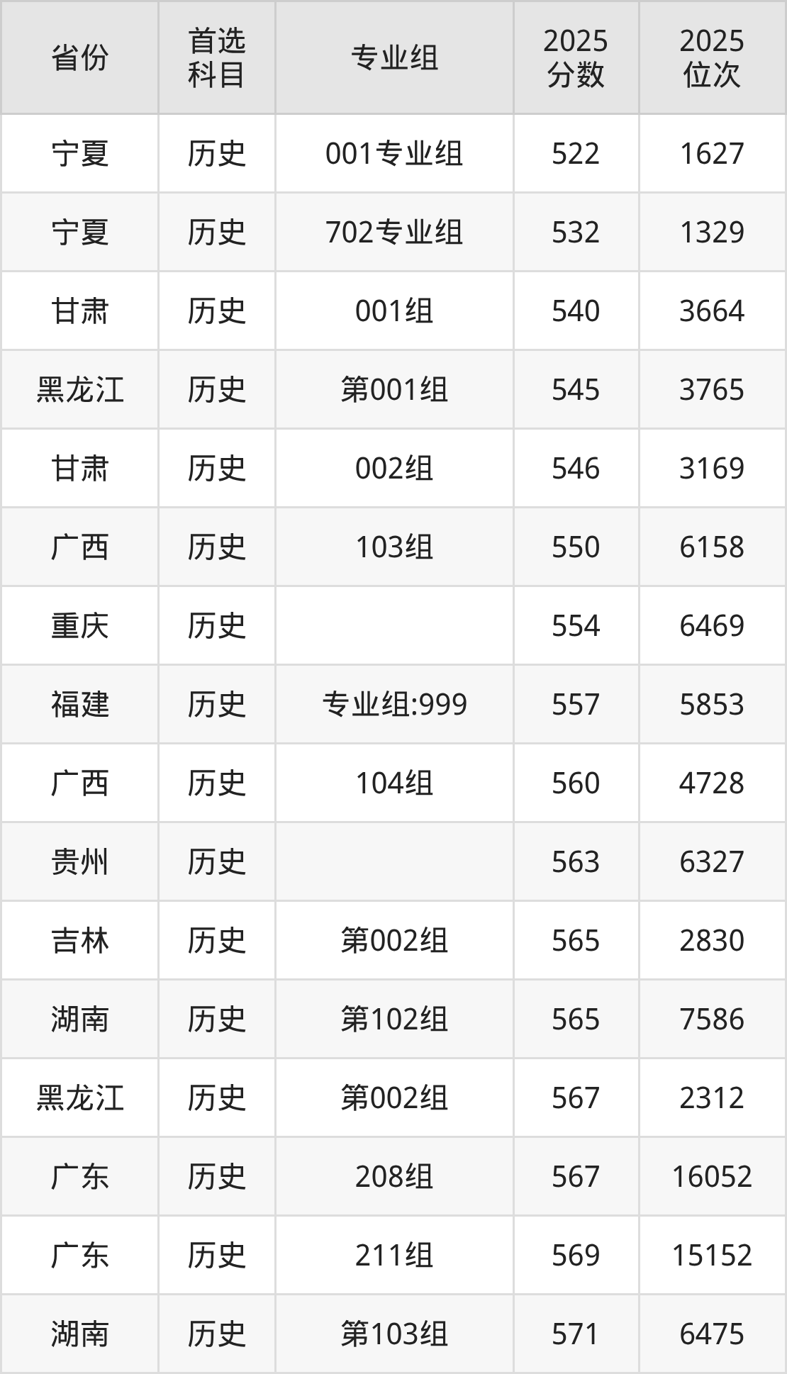 历史类最低分对应地区为宁夏(001专业组),录取位次为1627,超本科B118分;最高分对应地区为河北,录取位次为5759,超本科线124分。