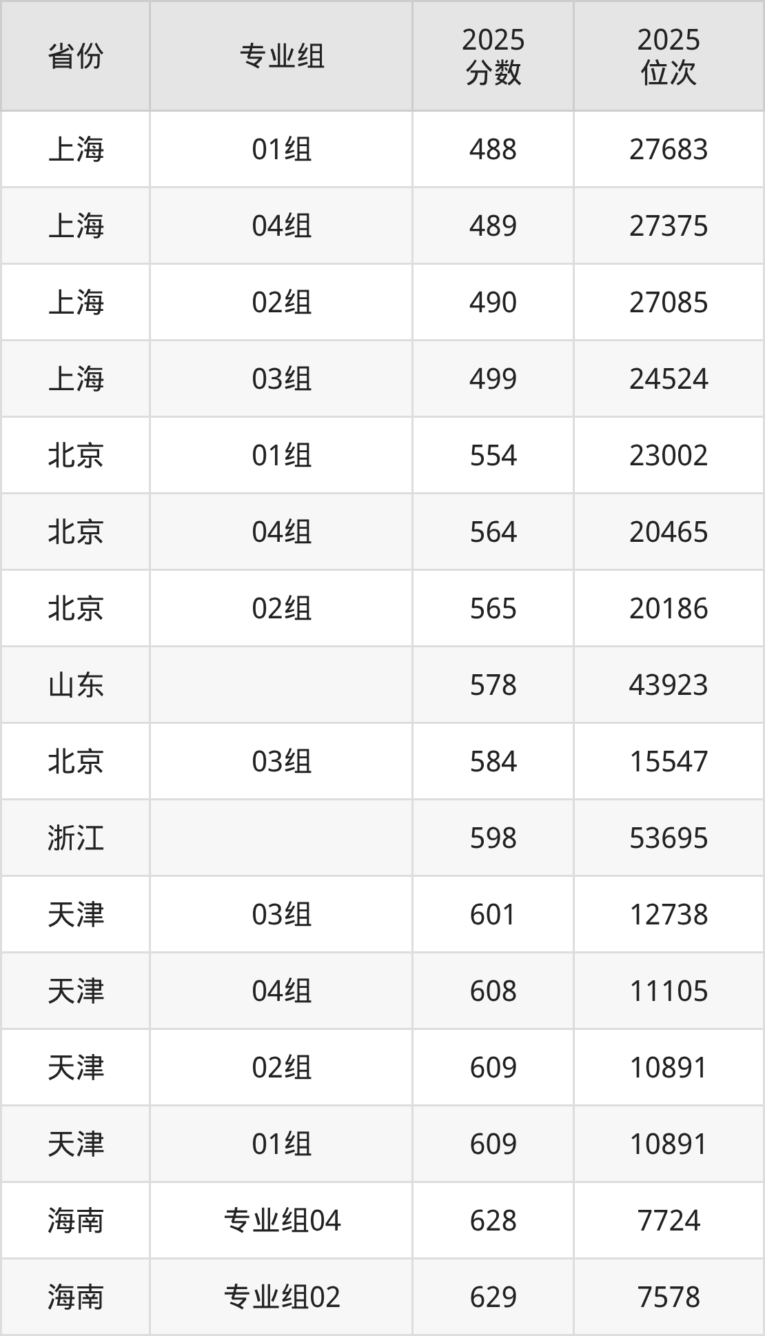 最低分对应地区为上海(01组),录取位次为27683,超本科线86分;最高分对应地区为海南(专业组05),录取位次为4963,超本科线172分。