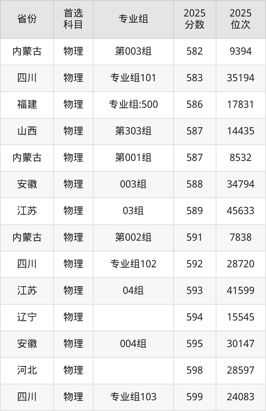 01组599分、12029名,02组596分、12729名,03组598分、12245名,04组609分、9715名,05组581分、16517名,06组586分、15193名,07组565分、20845名,中国民航大学235分;