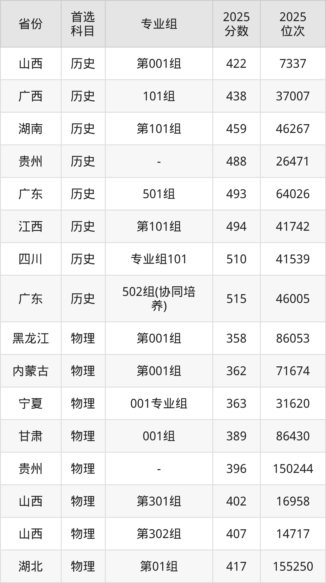 历史类最低分对应地区为山西(第001组),录取位次为7337,超专科线322分;最高分对应地区为广东(502组(协同培养)),录取位次为46005。