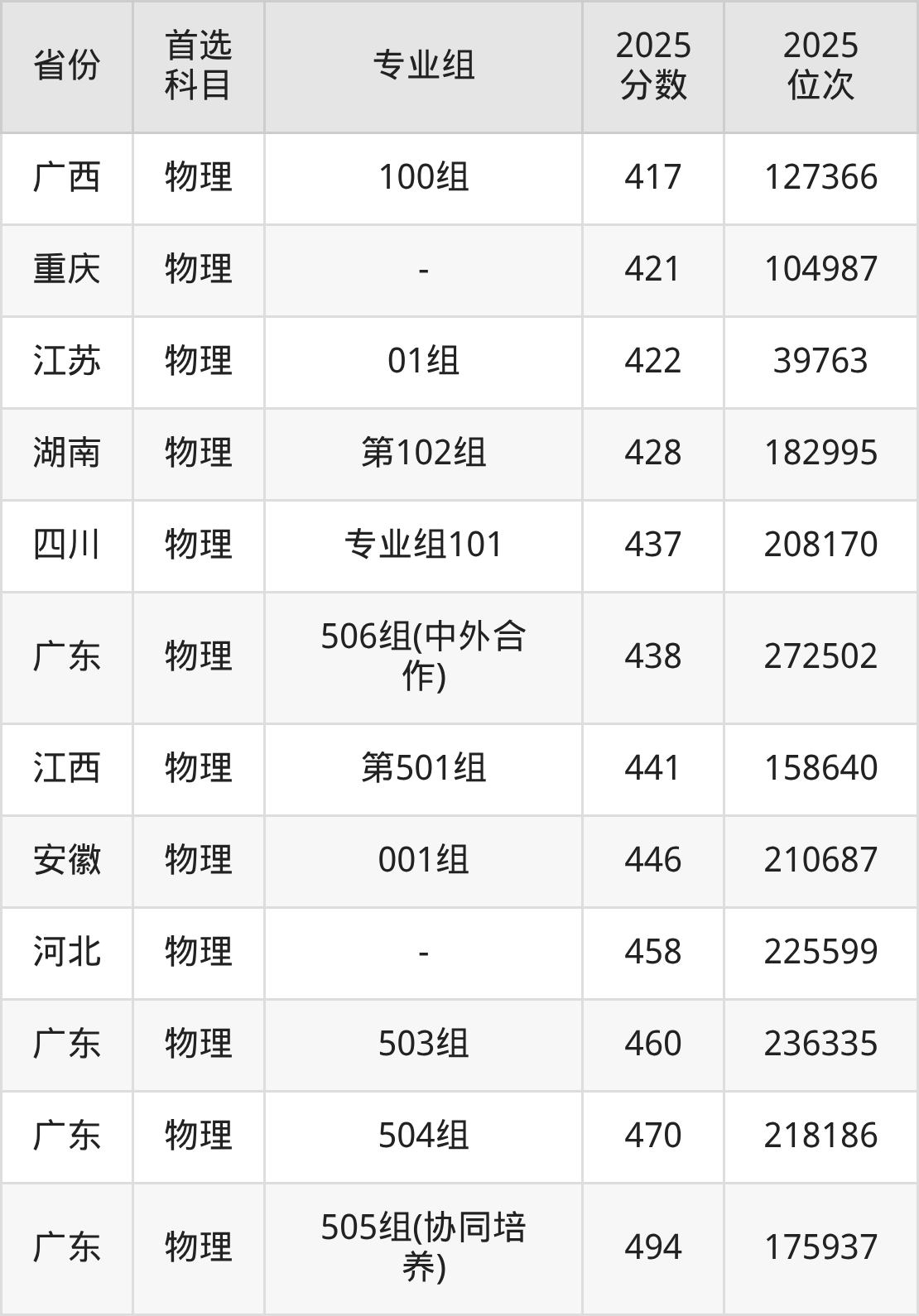 物理类:504组459分、222616名,505组448分、243153名,506组(协同培养)485分、174815名,507组(协同培养)486分、172653名,509组(中外合作)428分、277140名;