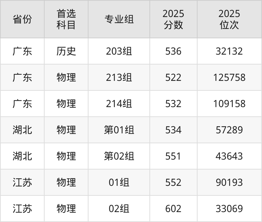 物理类最低分对应地区为广东(213组),录取位次为125758,超本科线86分;最高分对应地区为江苏(02组),录取位次为33069,超本科线139分。