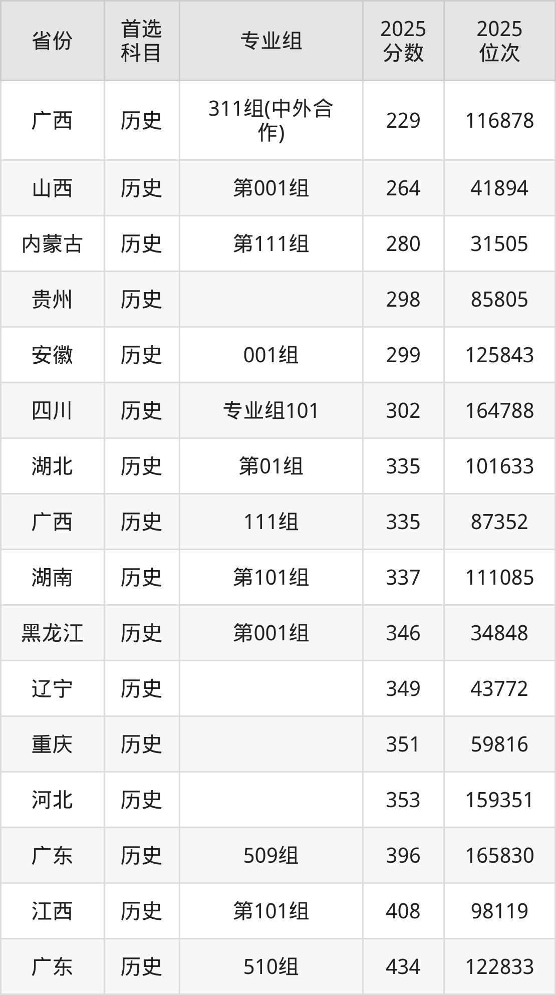历史类最低分对应地区为广西(311组(中外合作)),录取位次为116878,超专科线29分;最高分对应地区为广东(510组),录取位次为122833,超专科线219分。