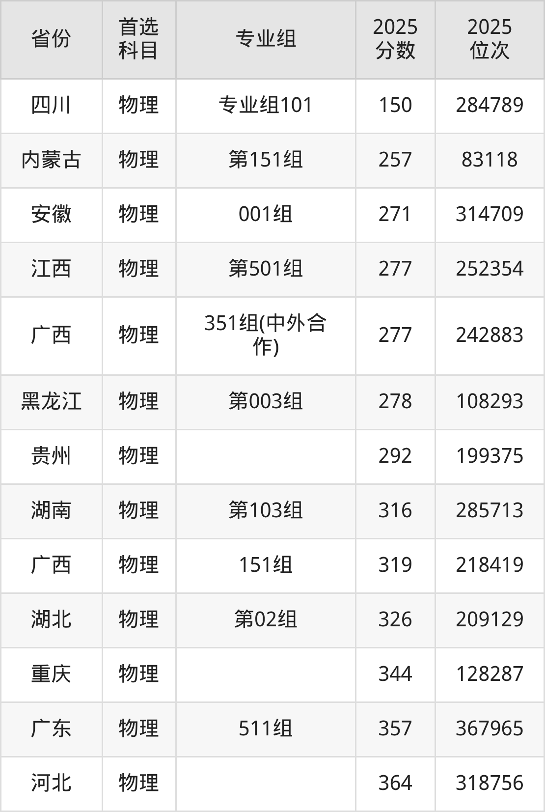 物理类最低分对应地区为四川(专业组101),录取位次为284789;最高分对应地区为河北,录取位次为318756,超专科线164分。