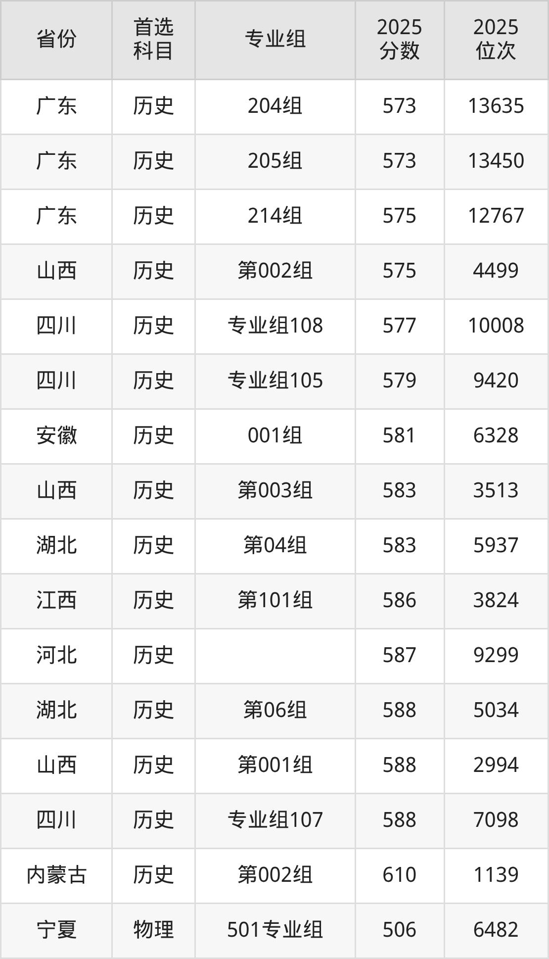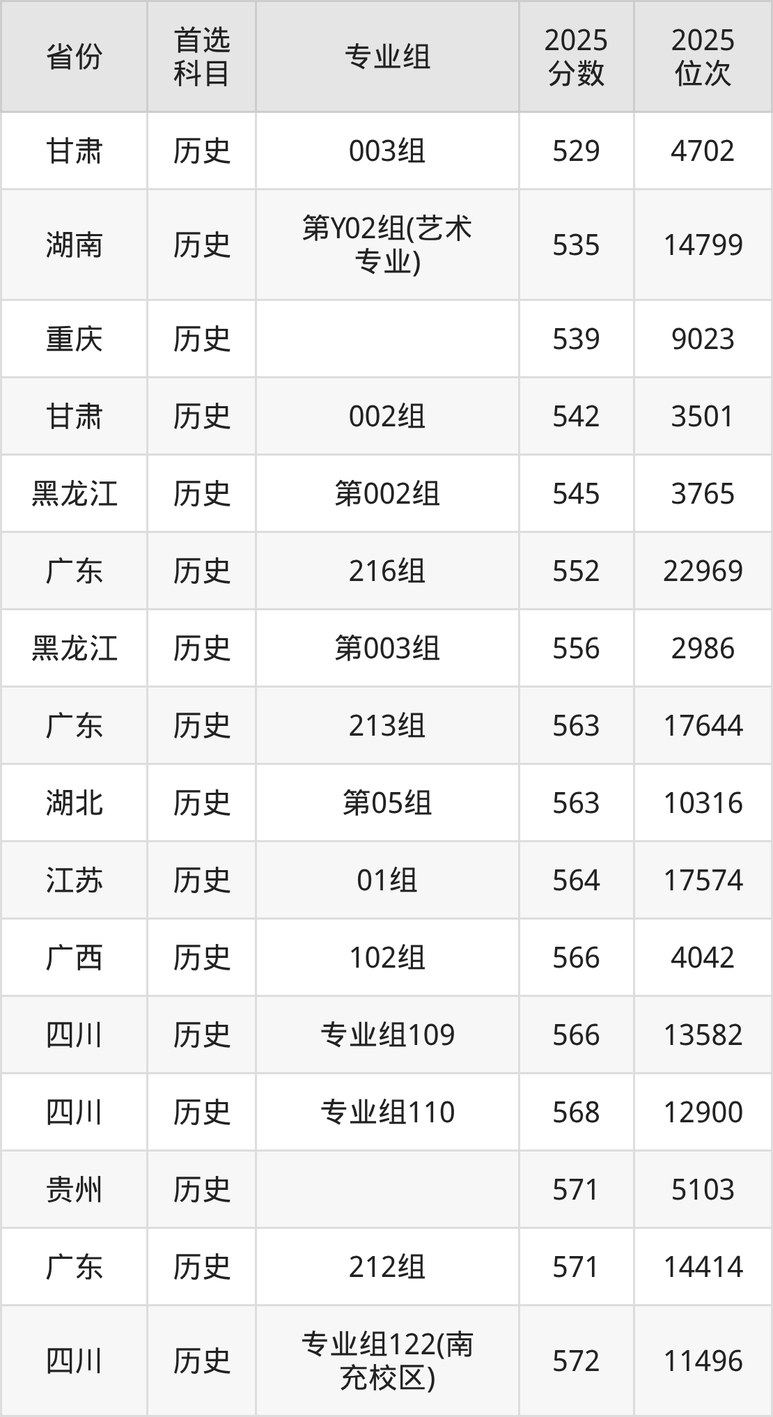 历史类:专业组105579分、9420名,专业组107588分、7098名,专业组108577分、10008名,专业组109566分、13582名,专业组110568分、12900名,专业组122(南充校区)572分、11496名;