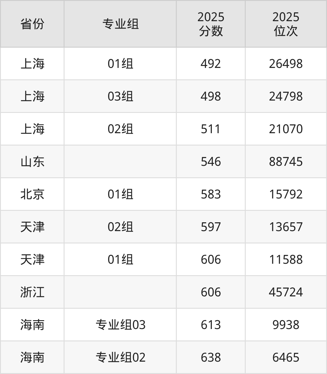 最低分对应地区为上海(01组),录取位次为26498;最高分对应地区为海南(专业组02),录取位次为6465,超本科线158分。