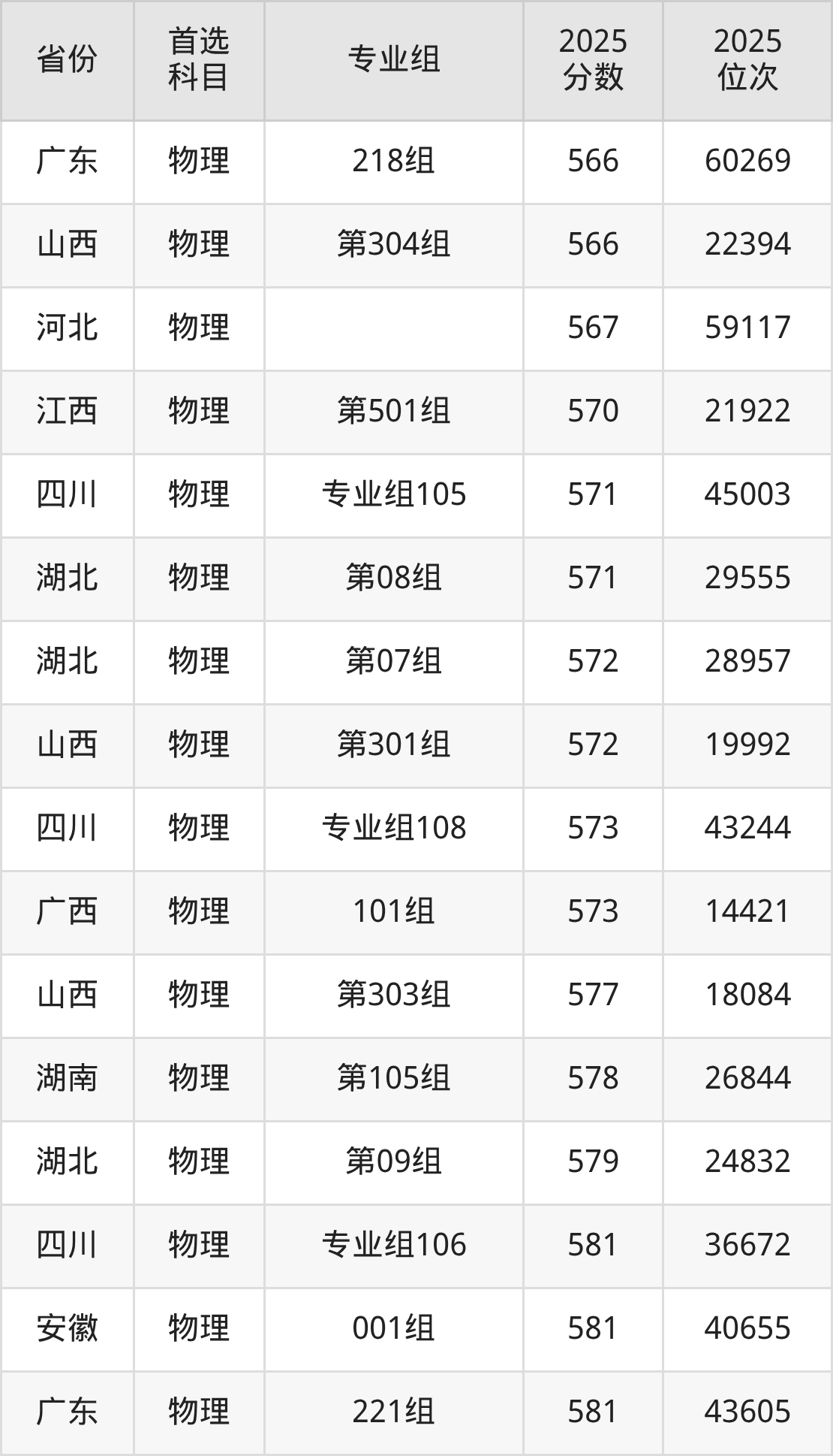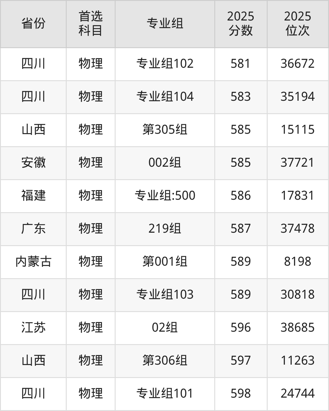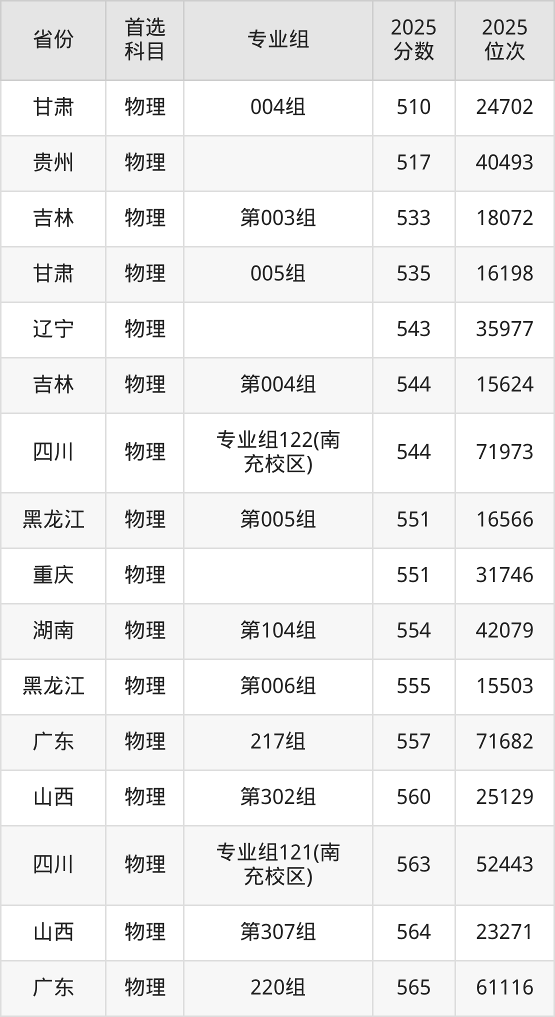 物理类:专业组101598分、24744名,专业组102581分、36672名,专业组103589分、30818名,专业组104583分、35194名,专业组105571分、45003名,专业组106581分、36672名,专业组108573分、43244名,专业组121(南充校区)563分、52443名,专业组122(南充校区)544分、71973名;