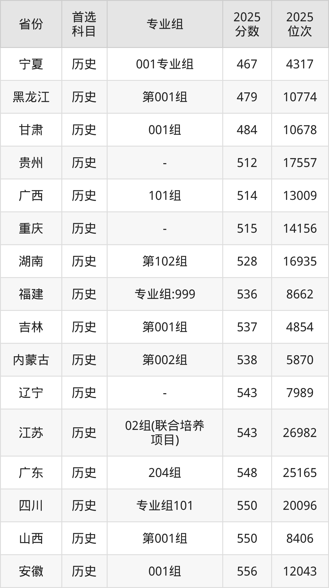 历史类:01组557分、20493名,02组(联合培养项目)543分、26982名;