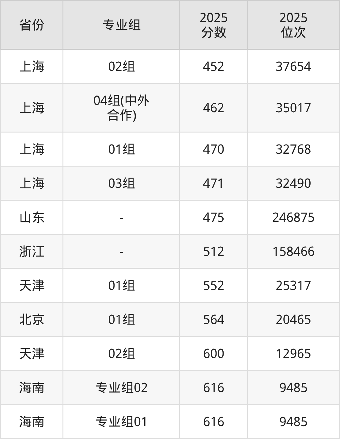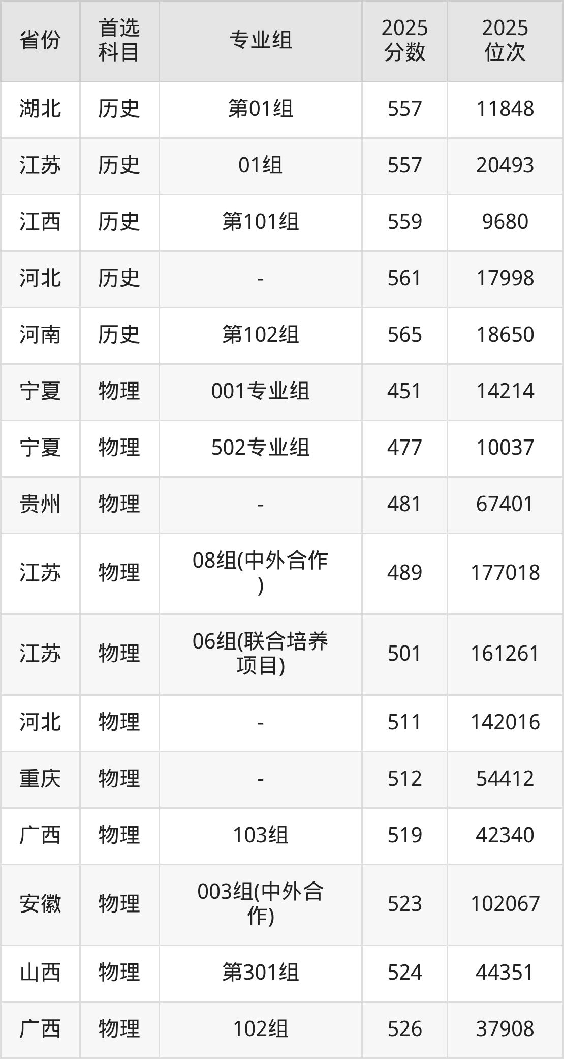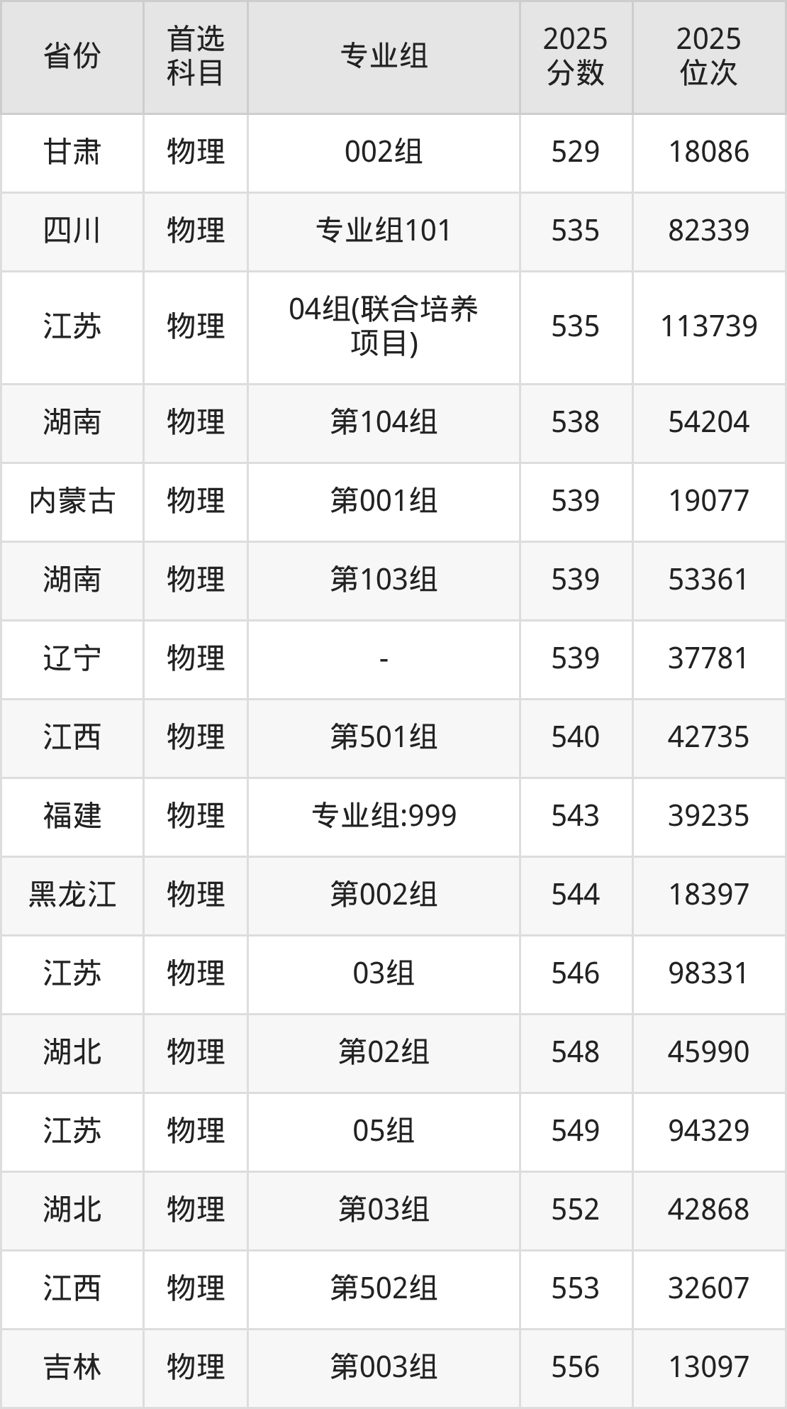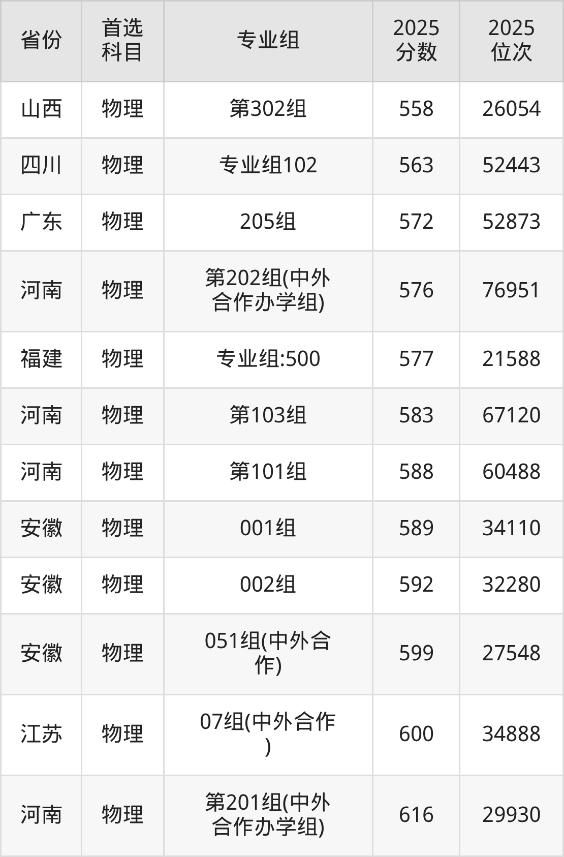 物理类:03组535分、98547名,04组(联合培养)528分、107573名,05组539分、93433名,06组(联合培养)475分、173585名,07组(中外合作)594分、34820名,08组(中外合作)468分、181000名;