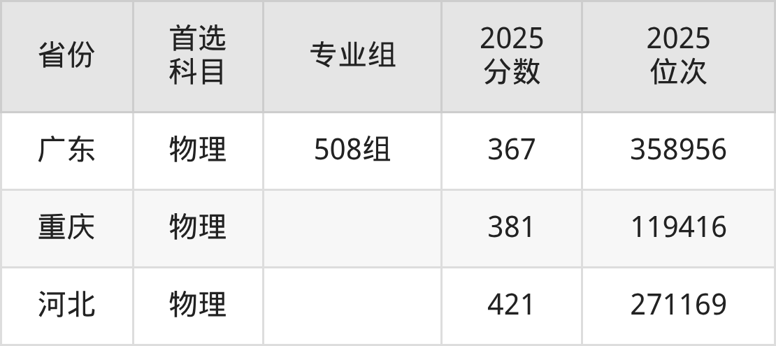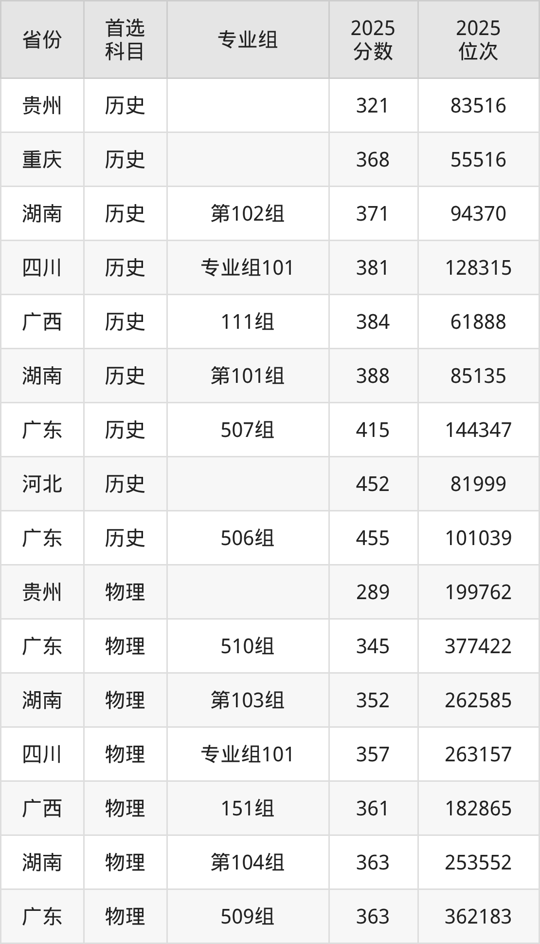 历史类最低分对应地区为贵州,录取位次为83516,超专科线141分;最高分对应地区为广东(506组),录取位次为101039。