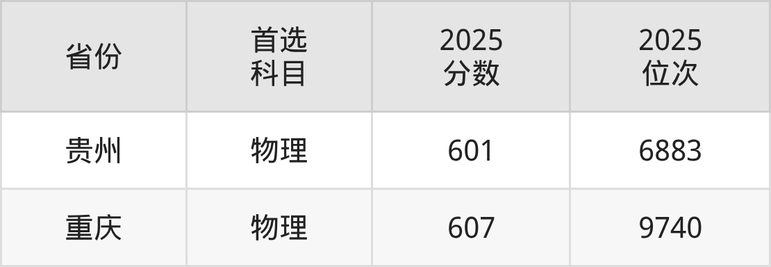 物理类最低分对应地区为贵州,录取位次为6883,超本科线214分;最高分对应地区为重庆,录取位次为9740,超本科线182分。