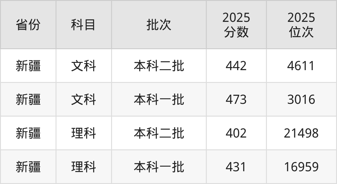 文科最低分对应地区为新疆,录取位次为4611,超二本线112分;最高分对应地区为新疆,录取位次为3016,超一本线22分。
