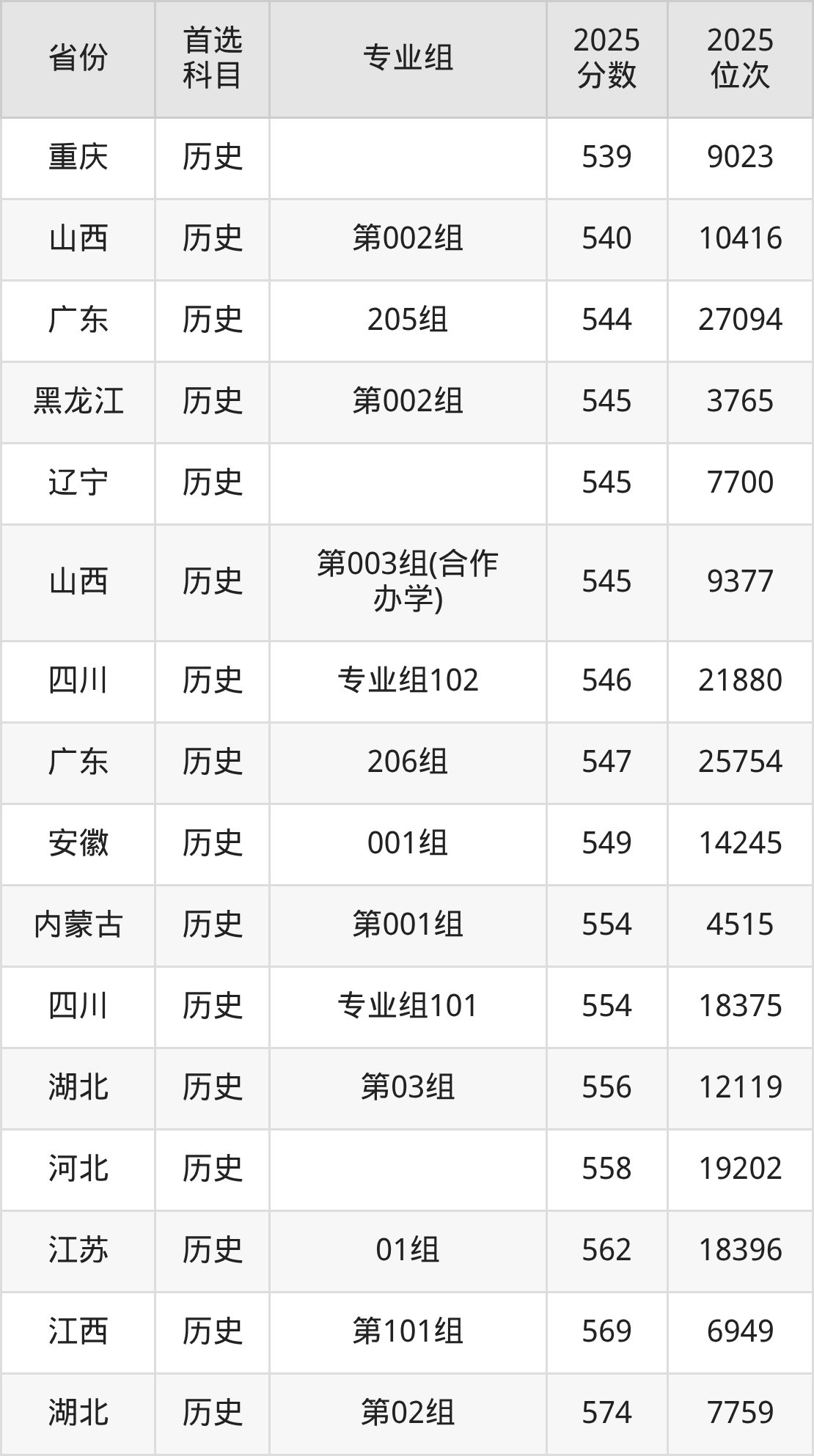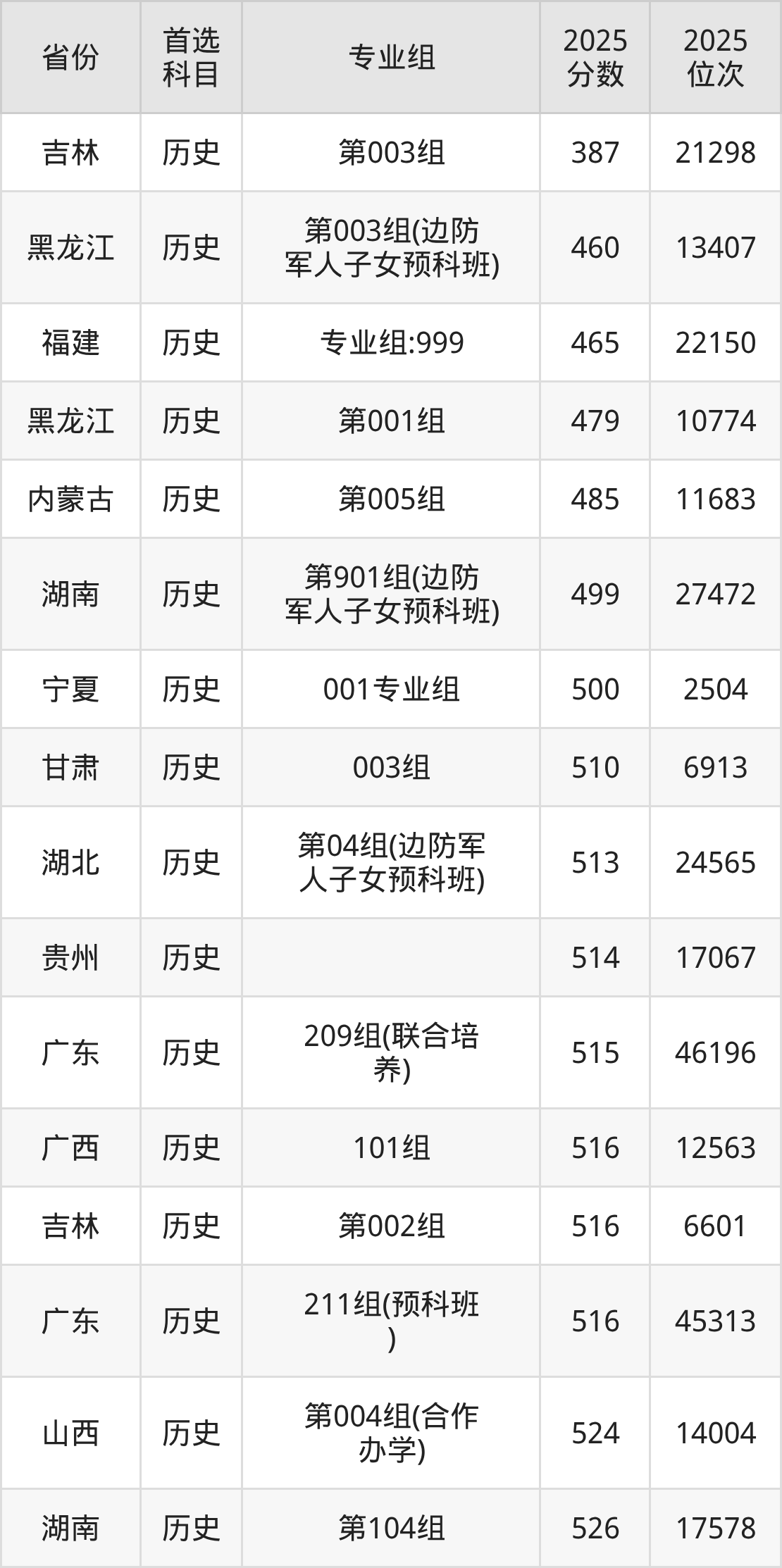 历史类最低分对应地区为吉林(第003组),录取位次为21298,超本科线3分;最高分对应地区为山西(第001组),录取位次为3632,超本科线139分。