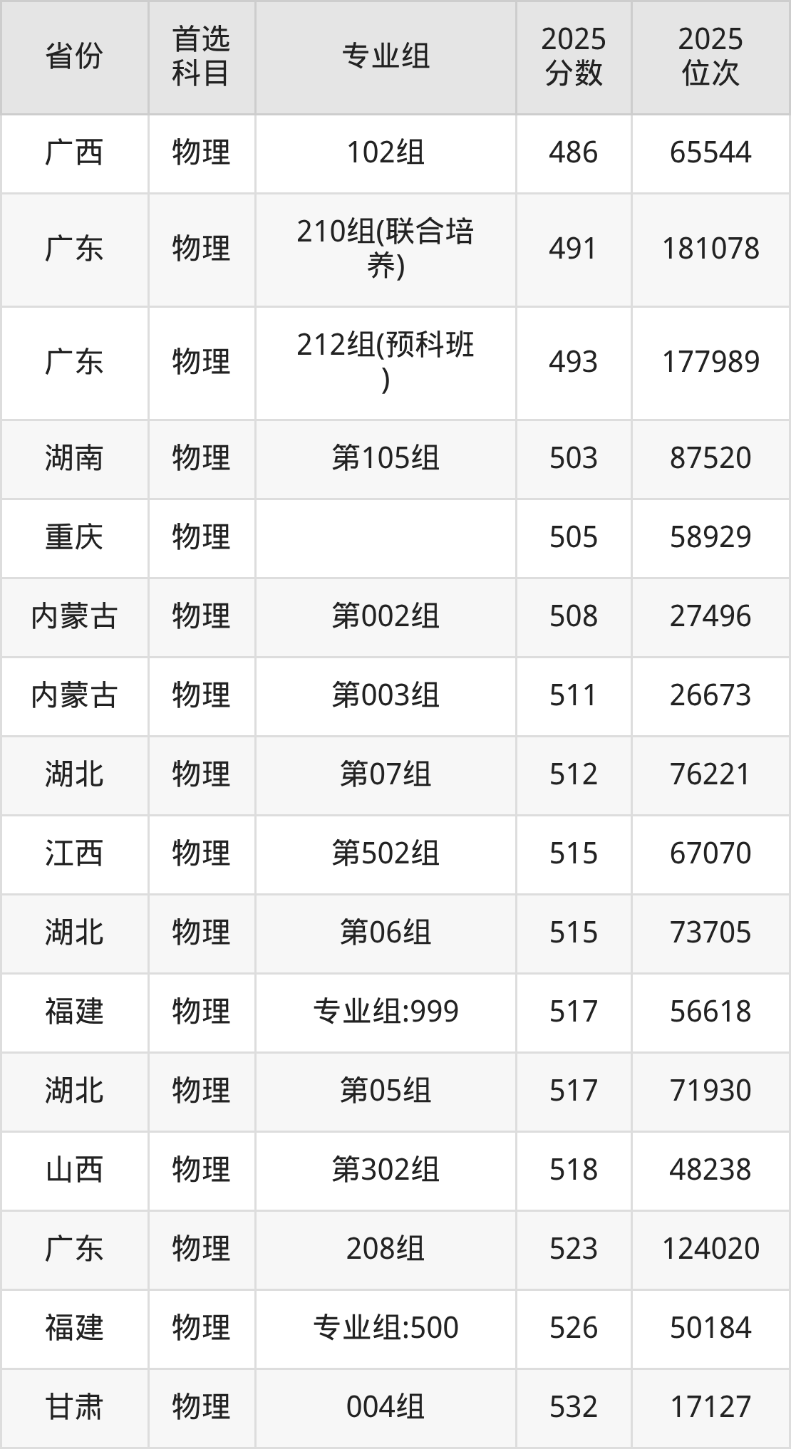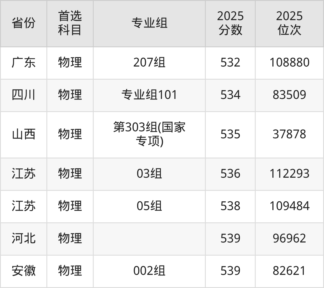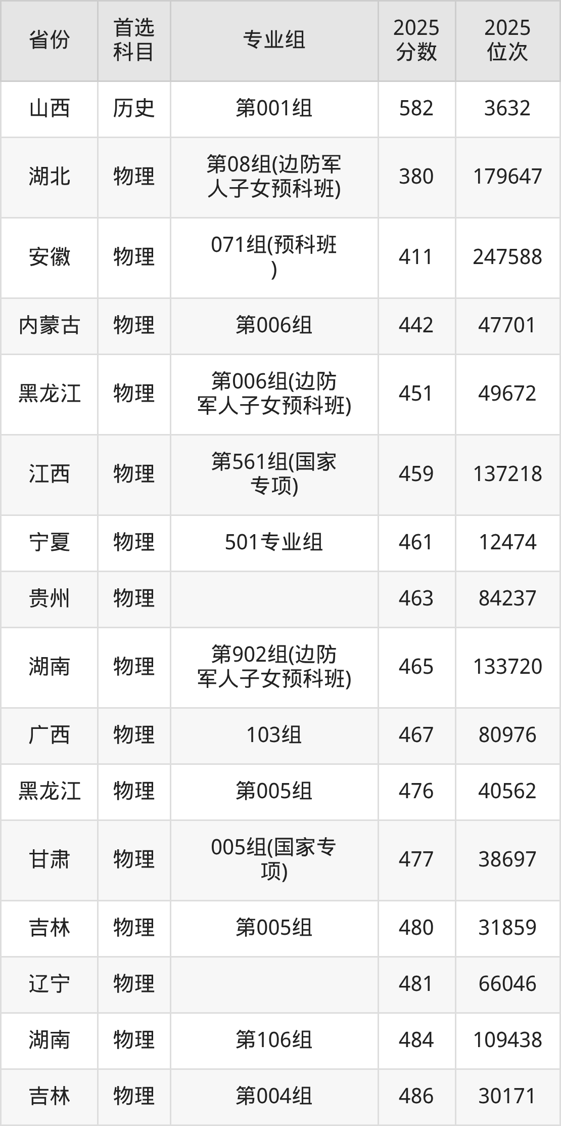 物理类最低分对应地区为湖北(第08组(边防军人子女预科班)),录取位次为179647,低本科线46分;最高分对应地区为安徽(002组),录取位次为82621,超本科线78分。