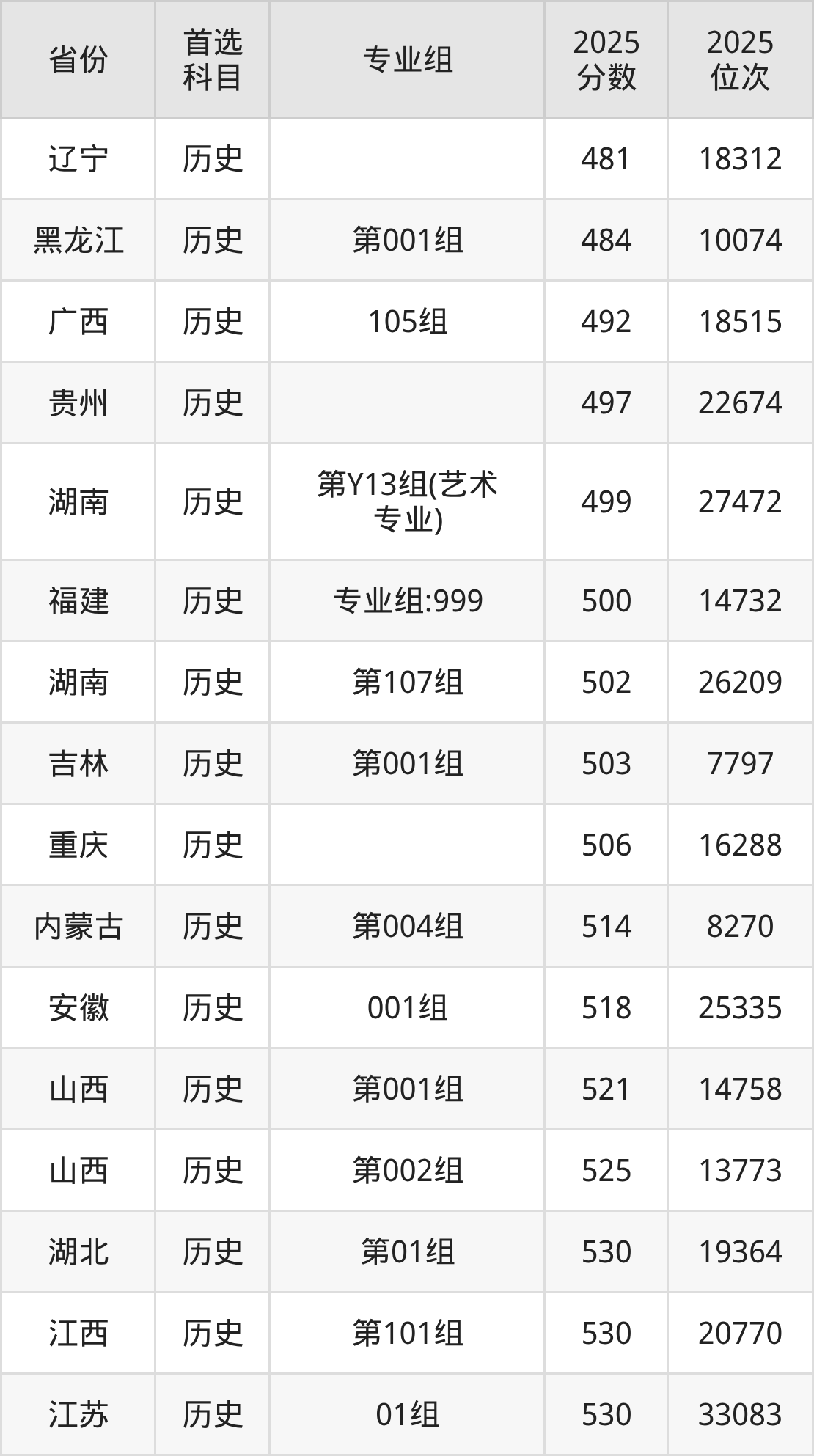 历史类最低分对应地区为辽宁,录取位次为18312,超本科线44分;最高分对应地区为河北,录取位次为23983。