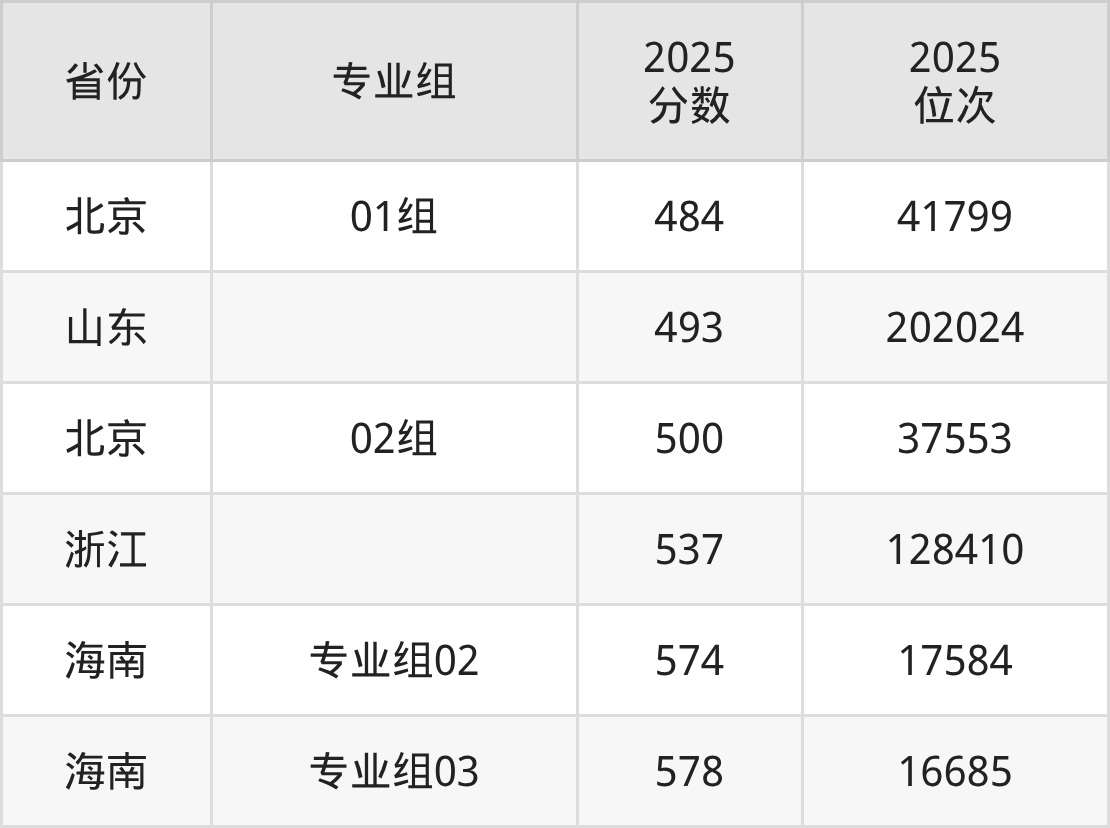 最低分对应地区为北京(01组),录取位次为41799,超本科线54分;最高分对应地区为海南(专业组03),录取位次为16685,超本科线98分。