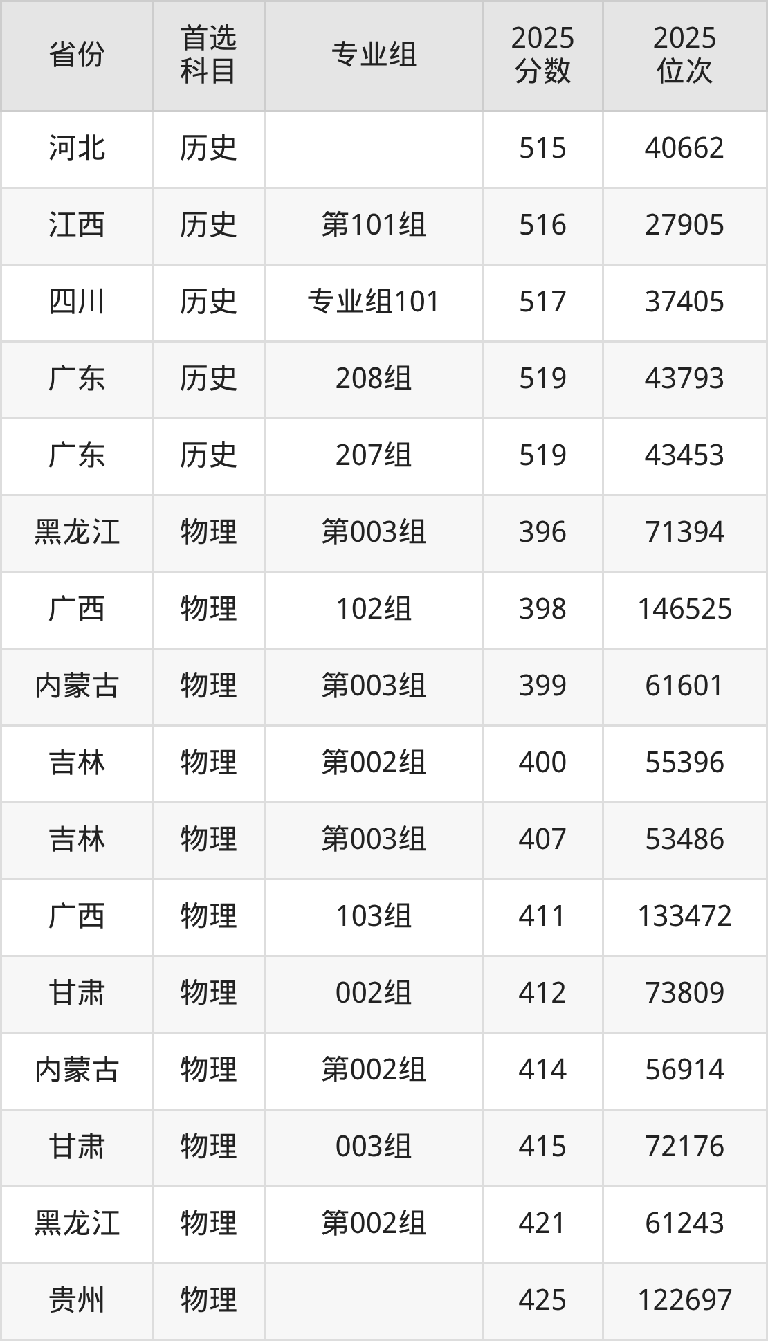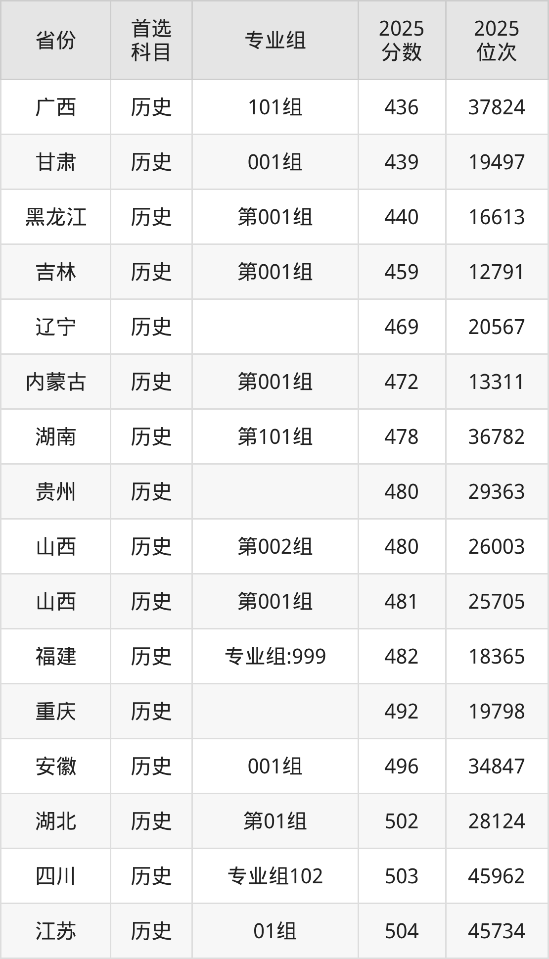 历史类最低分对应地区为广西(101组),录取位次为37824,超本科线34分;最高分对应地区为广东(207组),录取位次为43453,超本科线55分。
