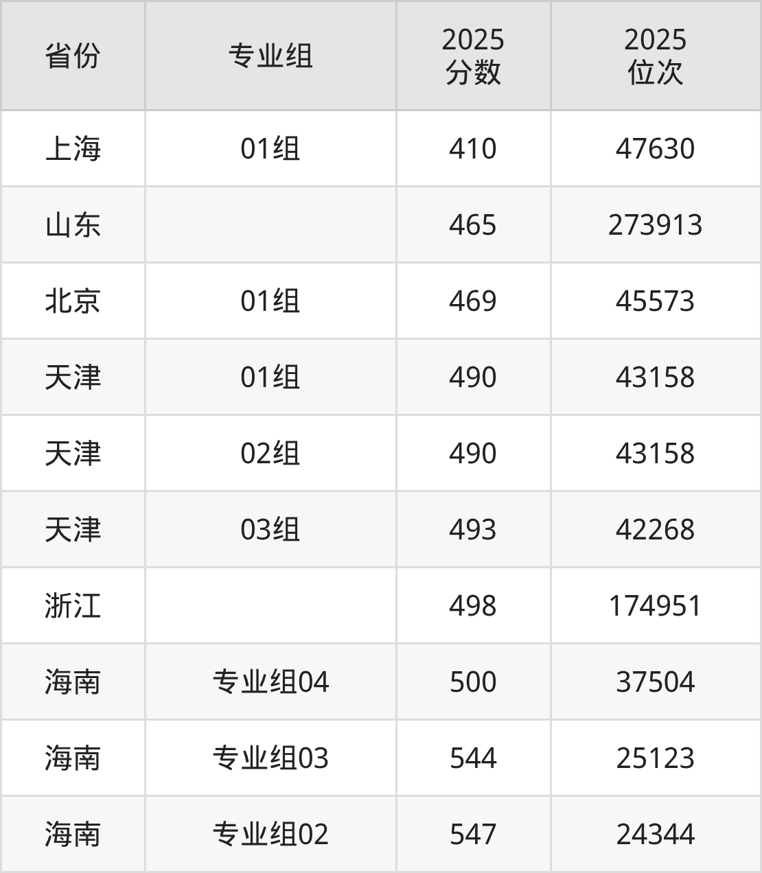 最低分对应地区为上海(01组),录取位次为47630,超本科线8分;最高分对应地区为海南(专业组02),录取位次为24344,超本科线67分。