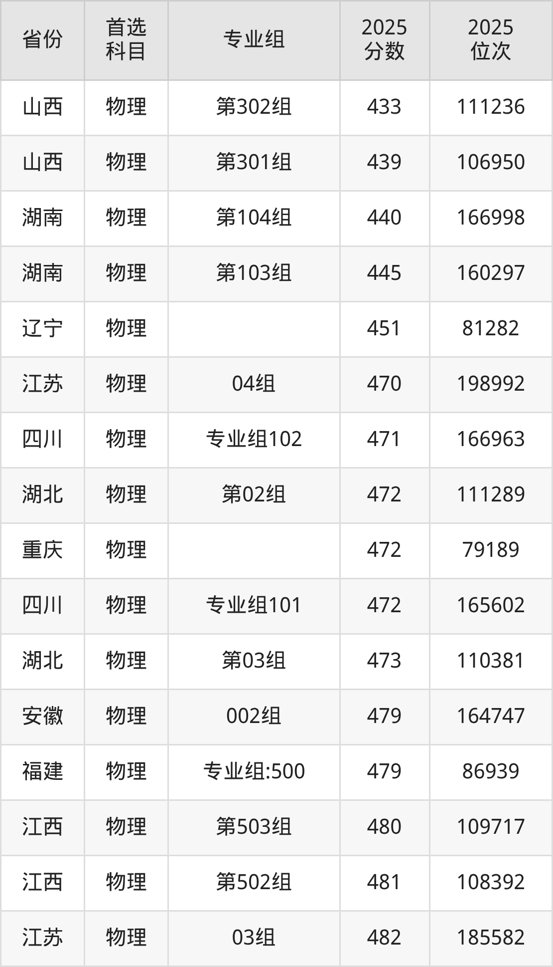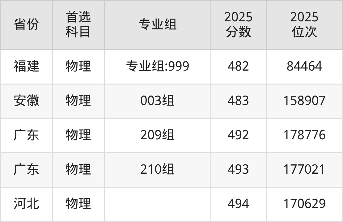 物理类最低分对应地区为黑龙江(第003组),录取位次为71394,超本科线36分;最高分对应地区为河北,录取位次为170629,超本科线35分。