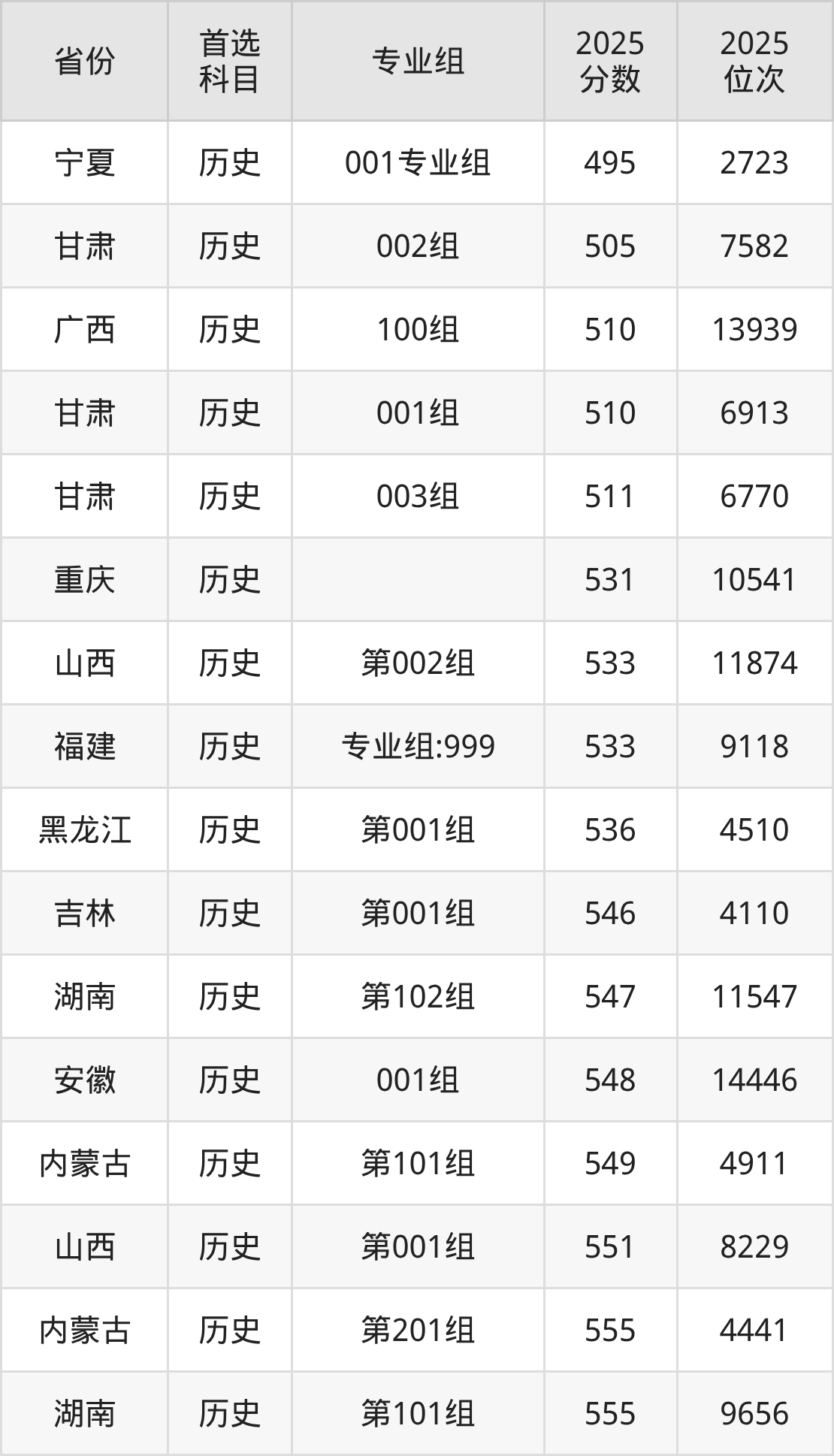 历史类最低分对应地区为宁夏(001专业组),录取位次为2723,超本科B91分;最高分对应地区为河北,录取位次为10447,超本科线106分。