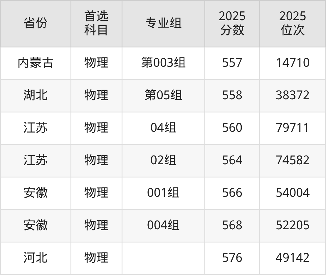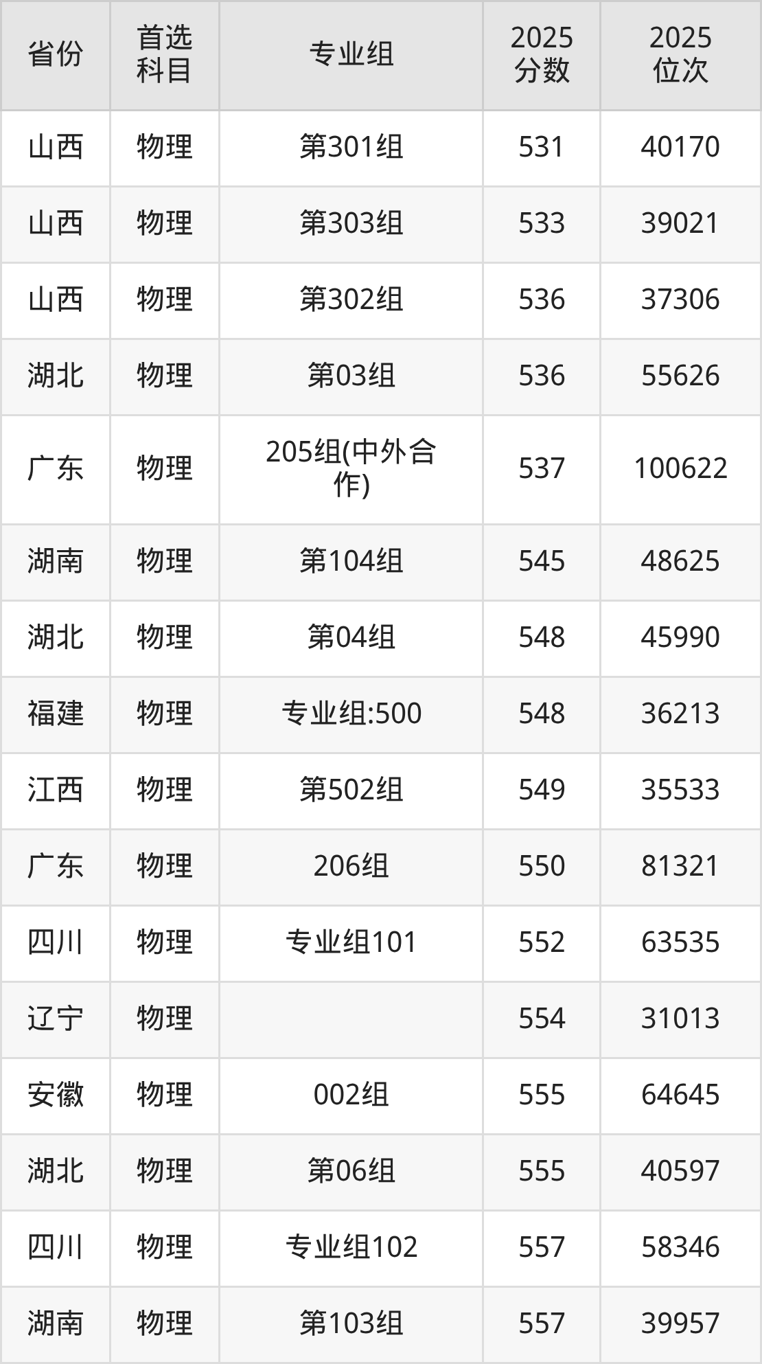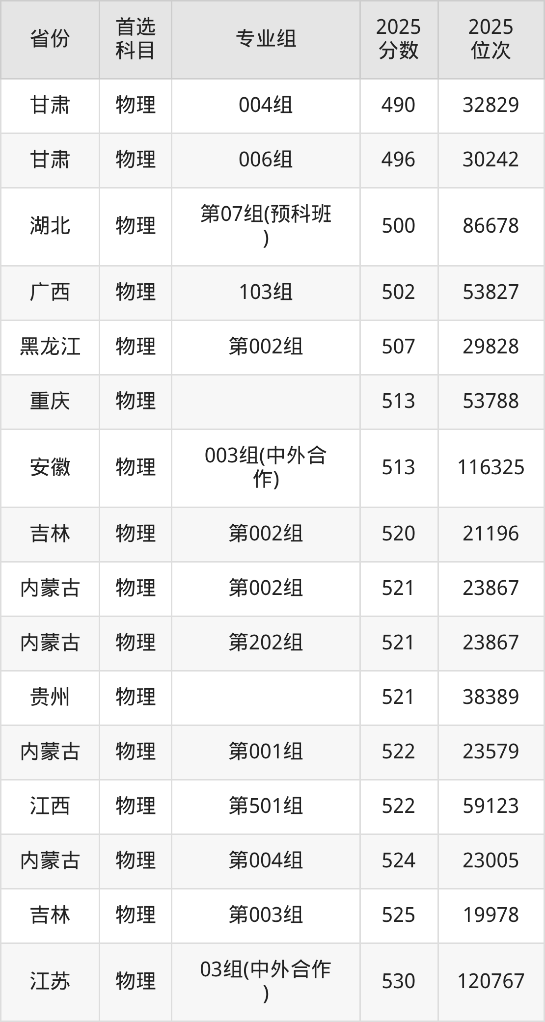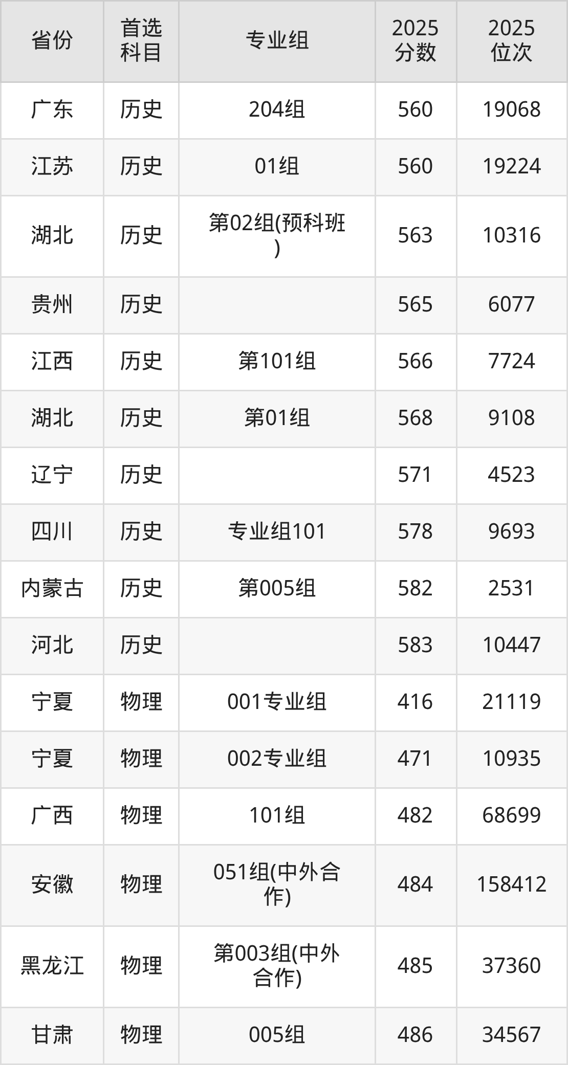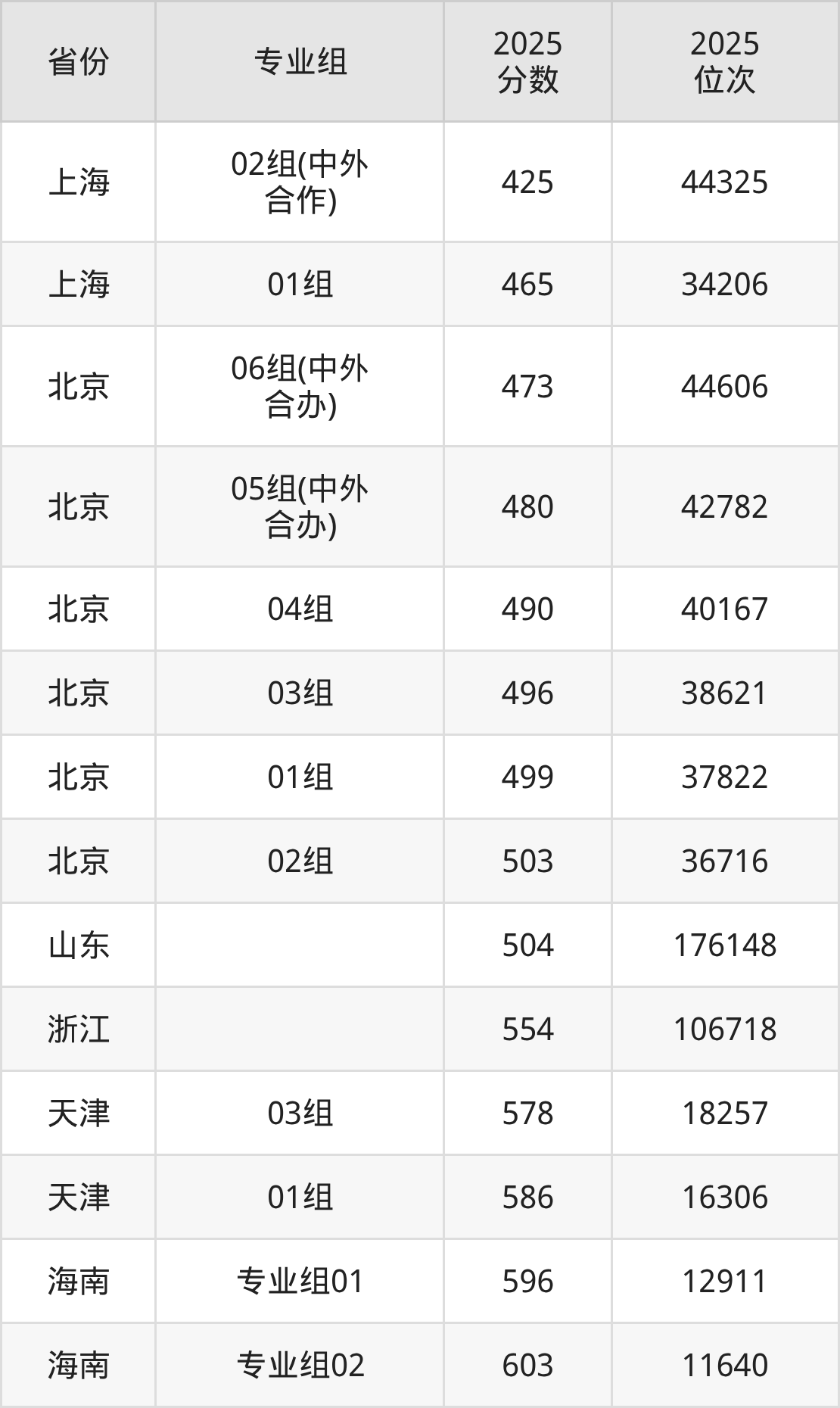01组499分、37822名,02组503分、36716名,03组496分、38621名,04组490分、40167名,05组(中外合办)480分、42782名,06组(中外合办)473分、44606名;