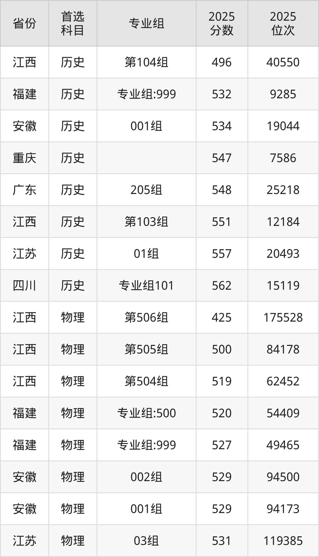 2025年江西警察学院在新高考3+1+2地区的录取分数线为:历史类496分-562分、物理类425分-554分。
