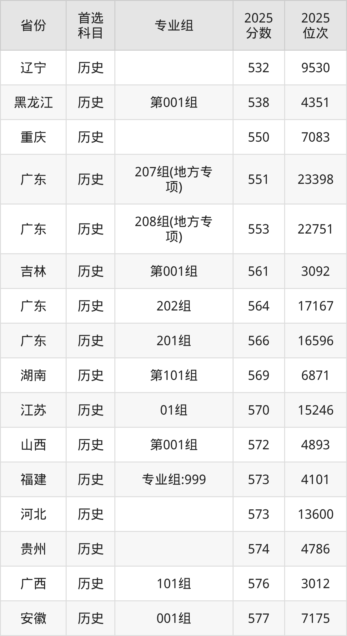 历史类:201组542分、17624名,202组544分、16784名,203组(地方专项)531分、22194名,204组(地方专项)516分、29425名;