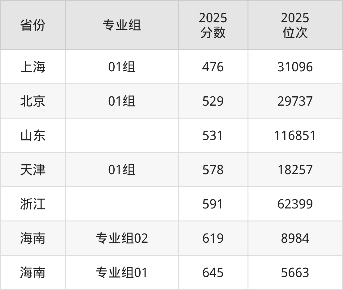 最低分对应地区为上海(01组),录取位次为31096,超本科线74分;最高分对应地区为海南(专业组01),录取位次为5663,超本科线165分。