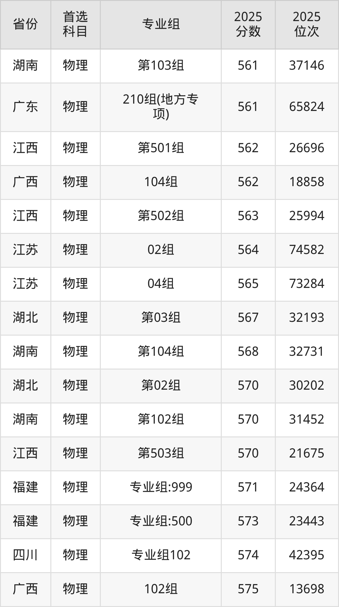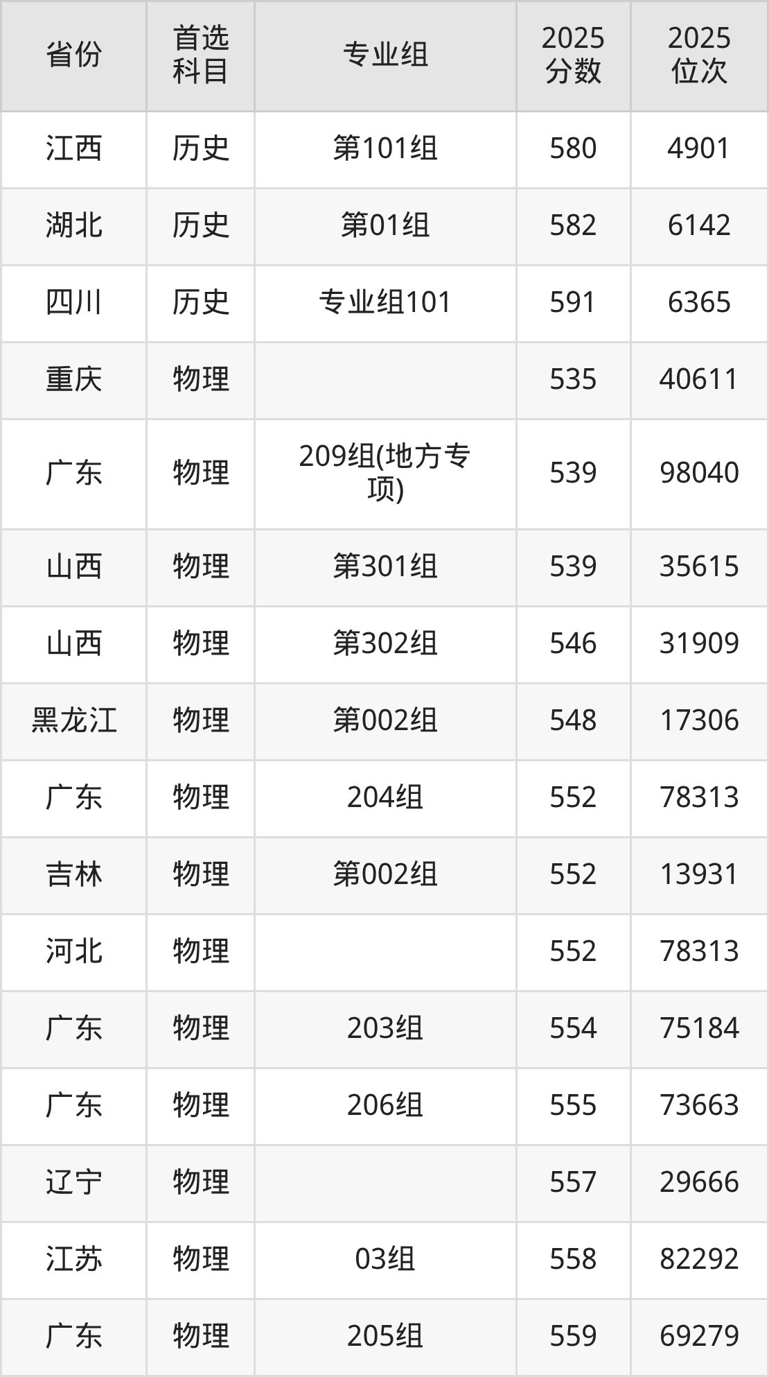 物理类:203组554分、75184名,204组552分、78313名,205组559分、69279名,206组555分、73663名,209组(地方专项)539分、98040名,210组(地方专项)561分、65824名;