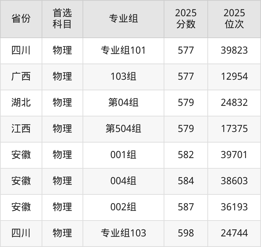 物理类:202组554分、70550名,203组555分、69388名,204组554分、70550名,207组(地方专项)558分、66000名,208组(地方专项)548分、77621名。
